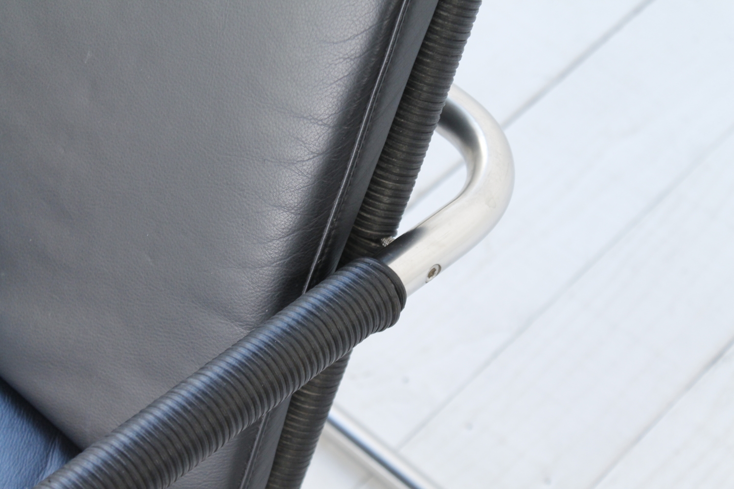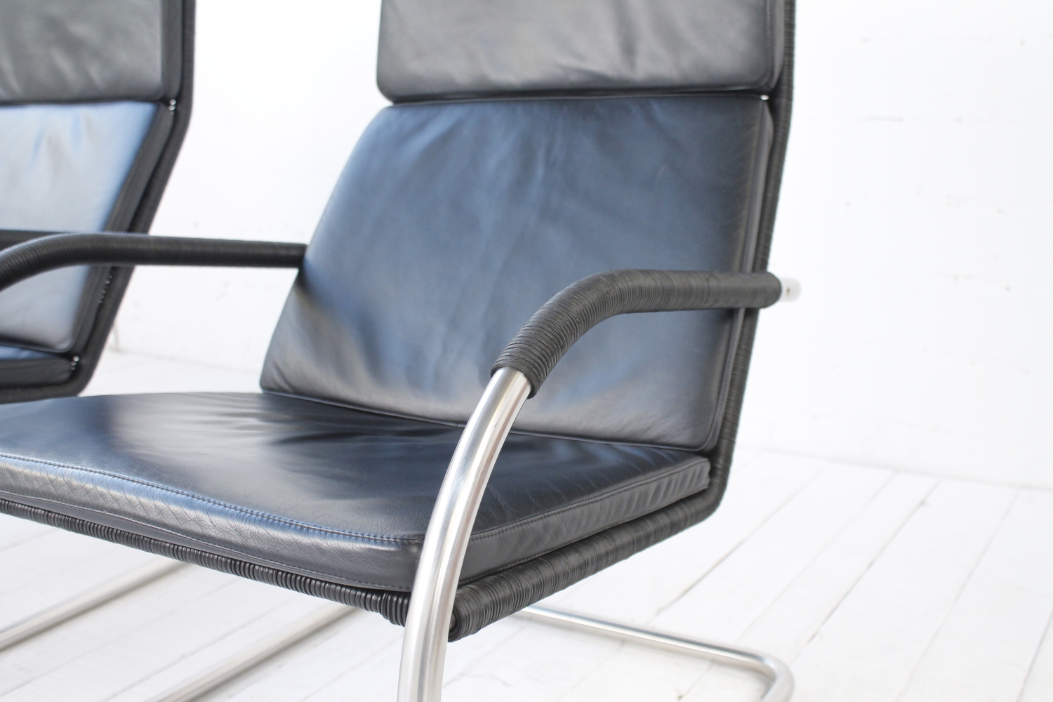 - Beschreibung2er Set Freischwinger mit einer Rahmenkonstruktion aus verchromtem, gebogenem Stahlrohr. Sitzfläche aus Kunststoffgeflecht mit weichen Auflagekissen aus schwarzem Leder.