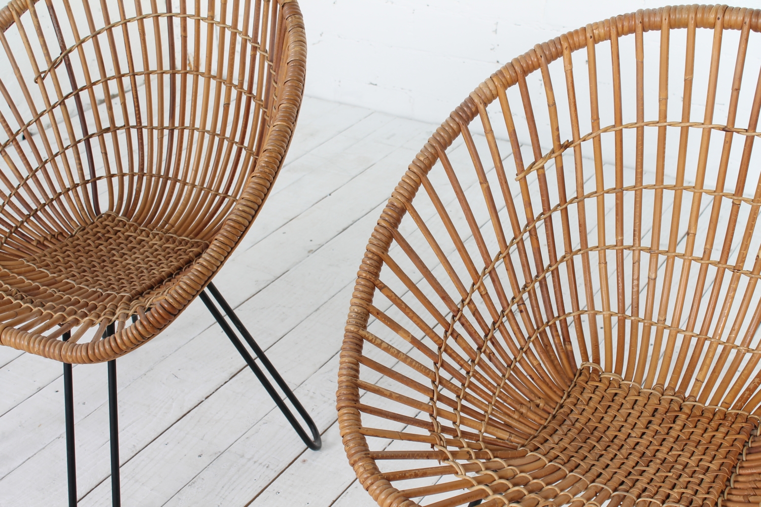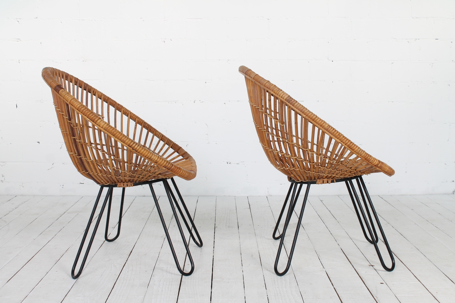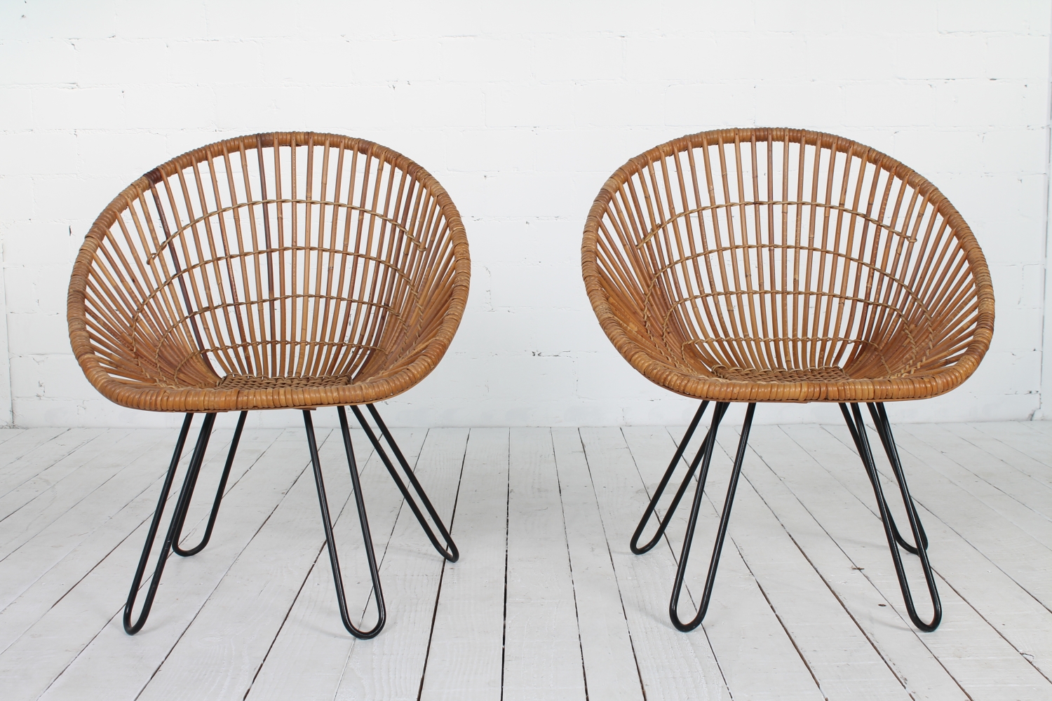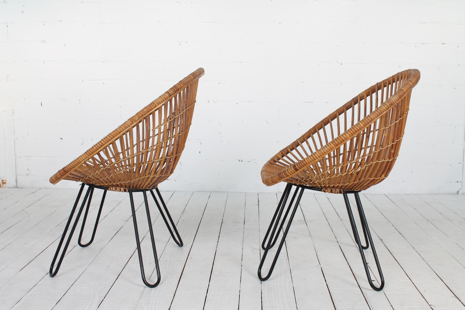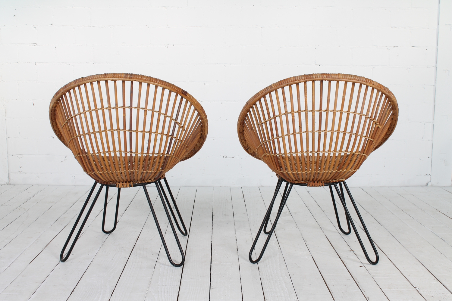 2er Set VintageKorbsessel mit einer Sitzschale aus geflochtenem Bambus. Die Schalen sind auf schwarz lackierten Hairpin-legs aus rundem Stahl montiert.