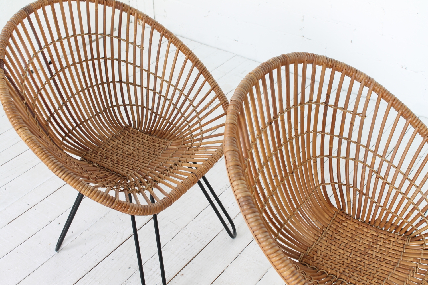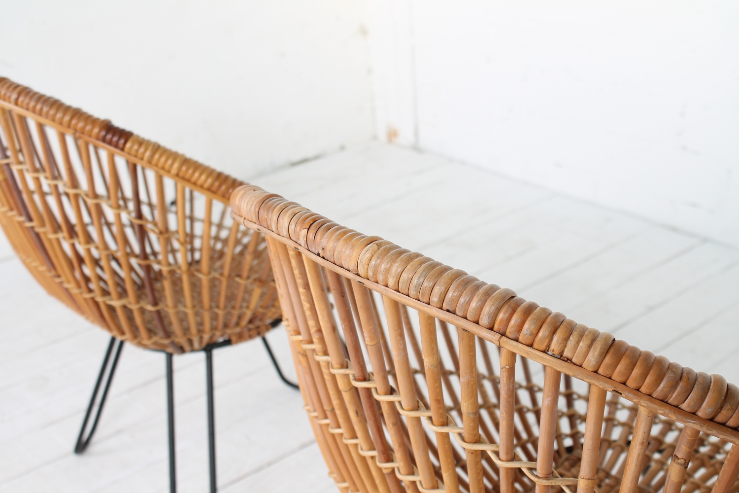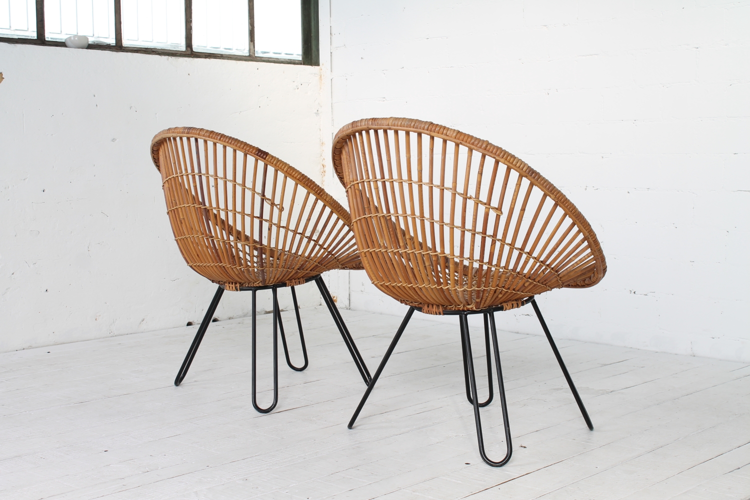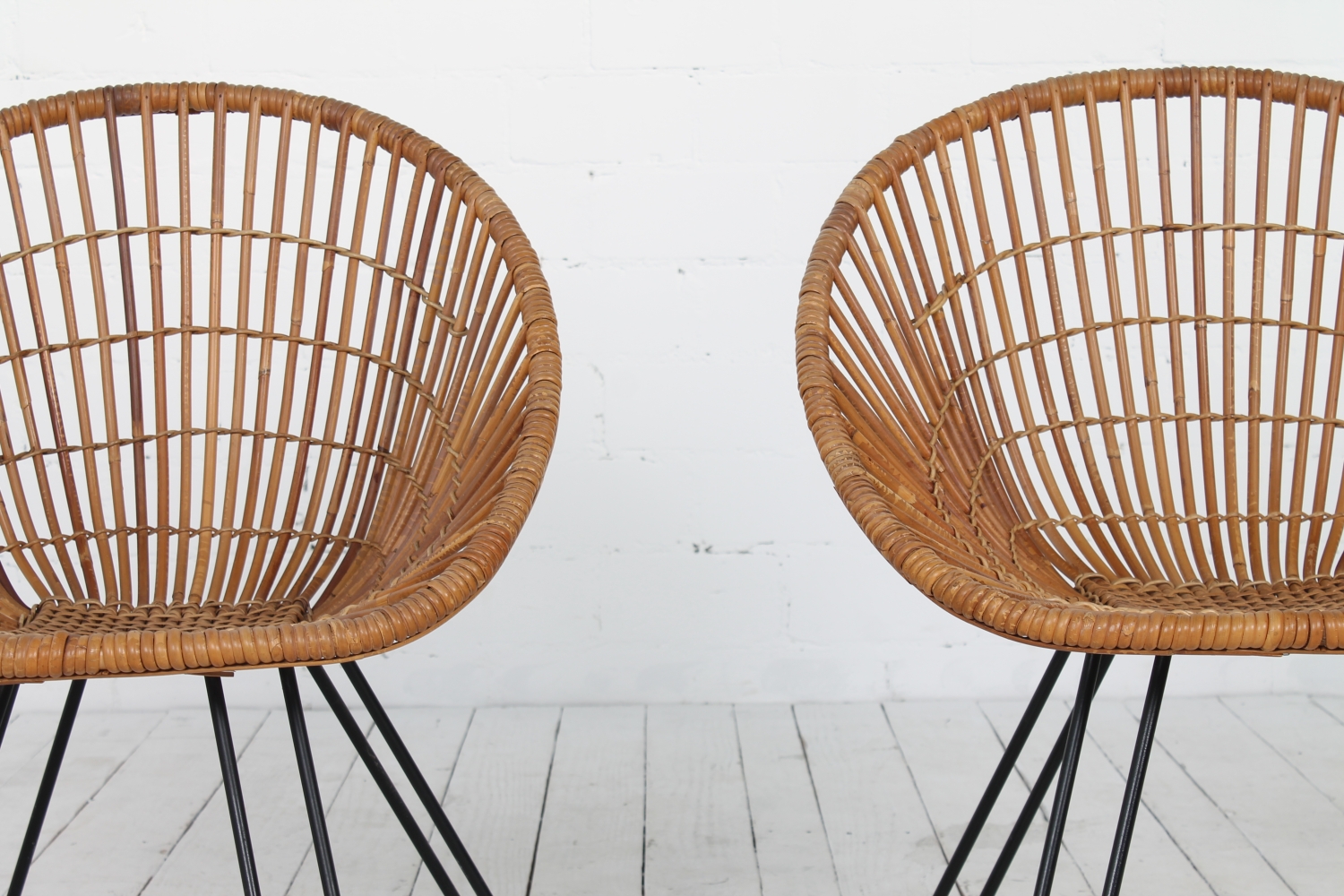 2er Set VintageKorbsessel mit einer Sitzschale aus geflochtenem Bambus. Die Schalen sind auf schwarz lackierten Hairpin-legs aus rundem Stahl montiert.
