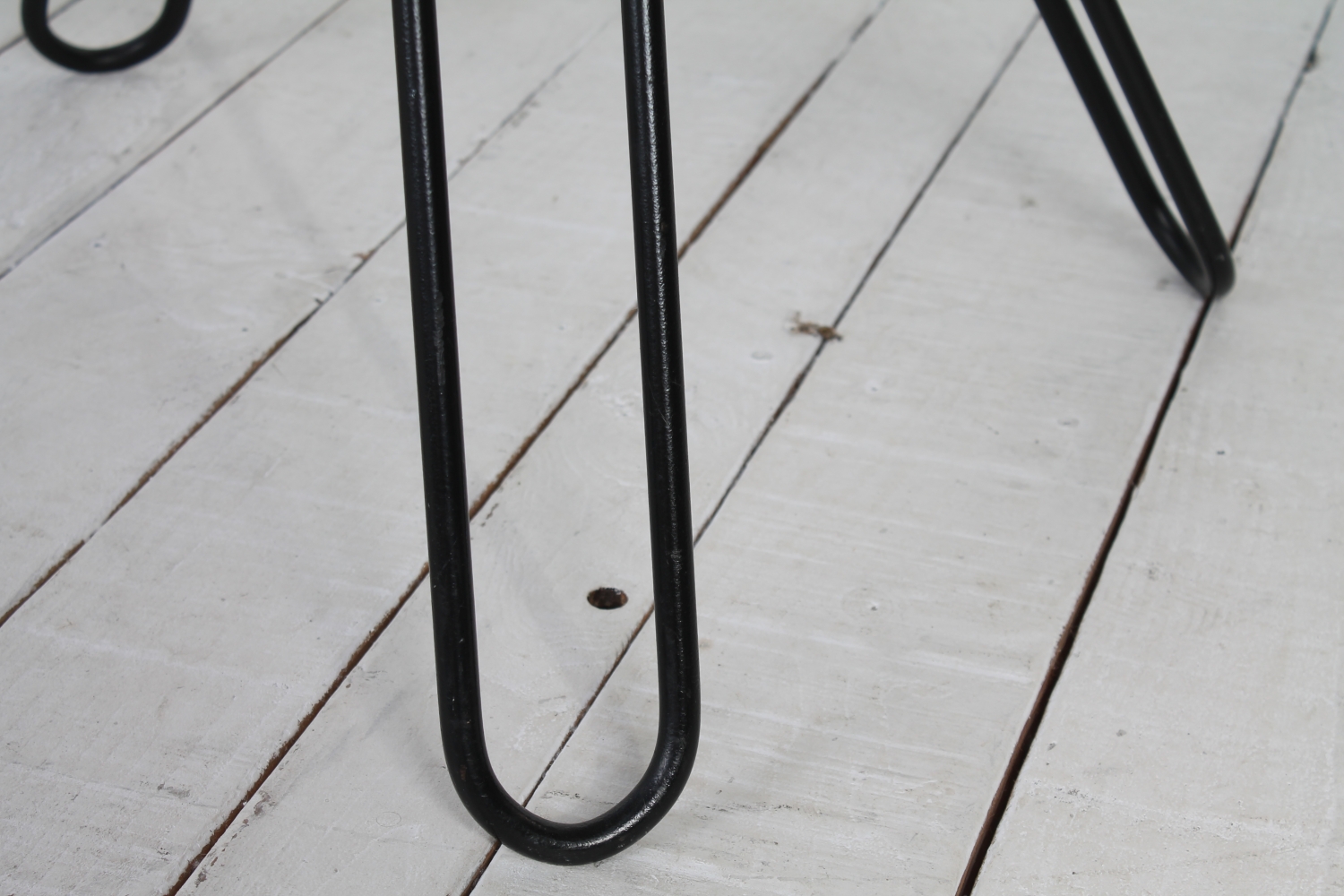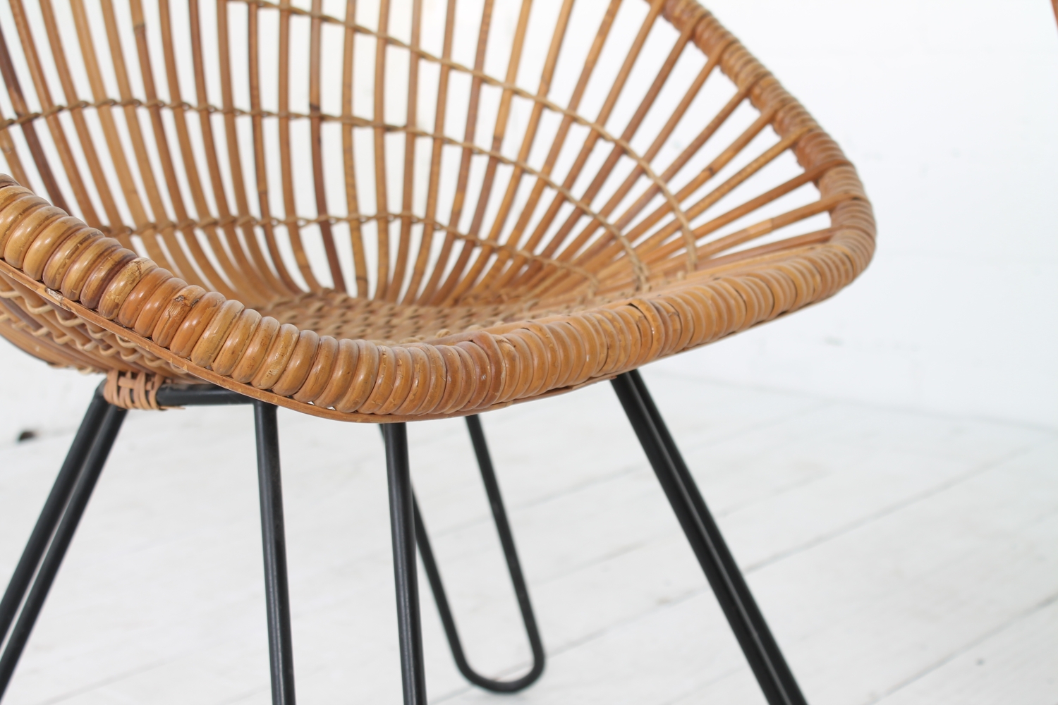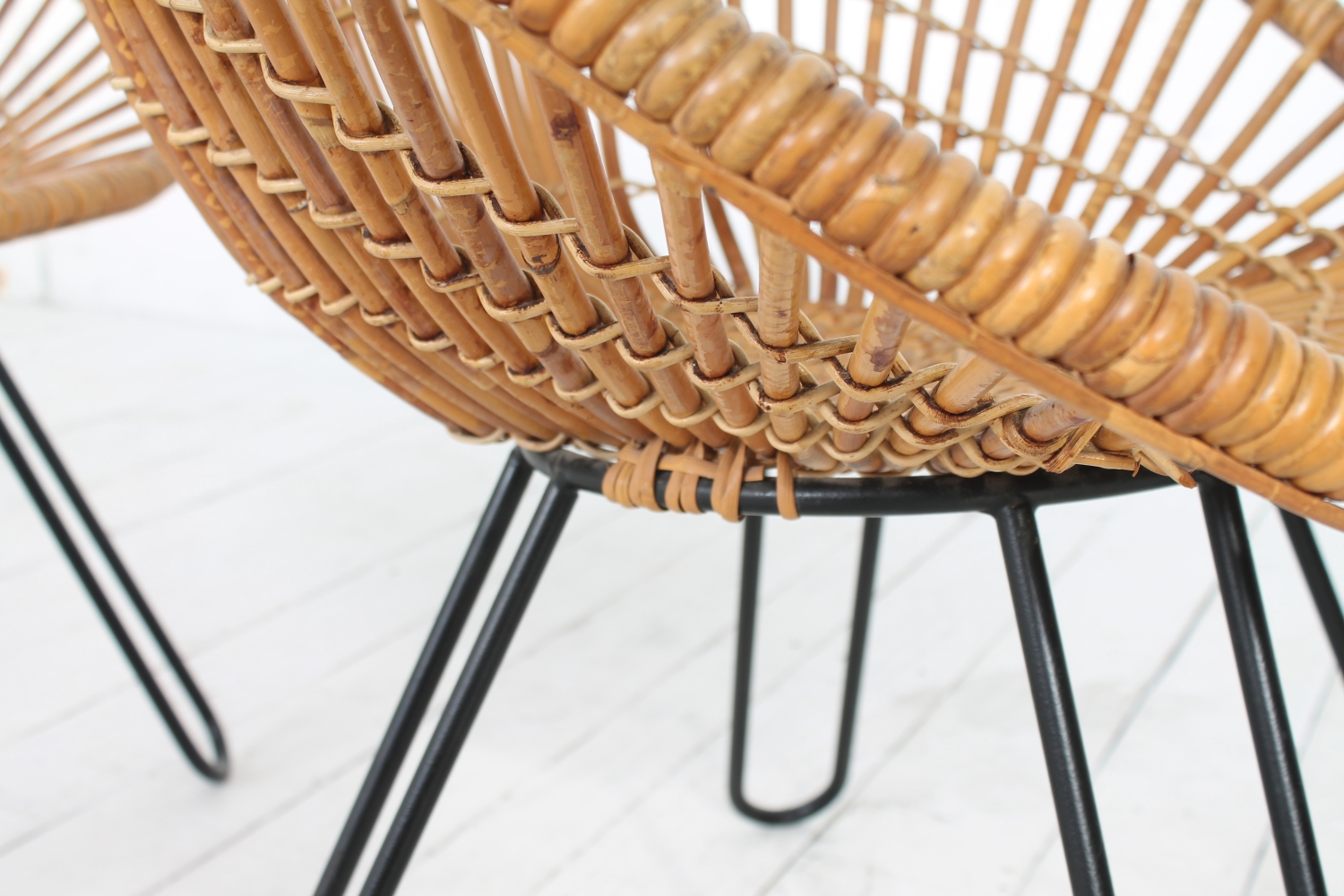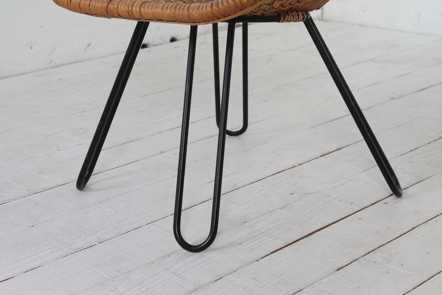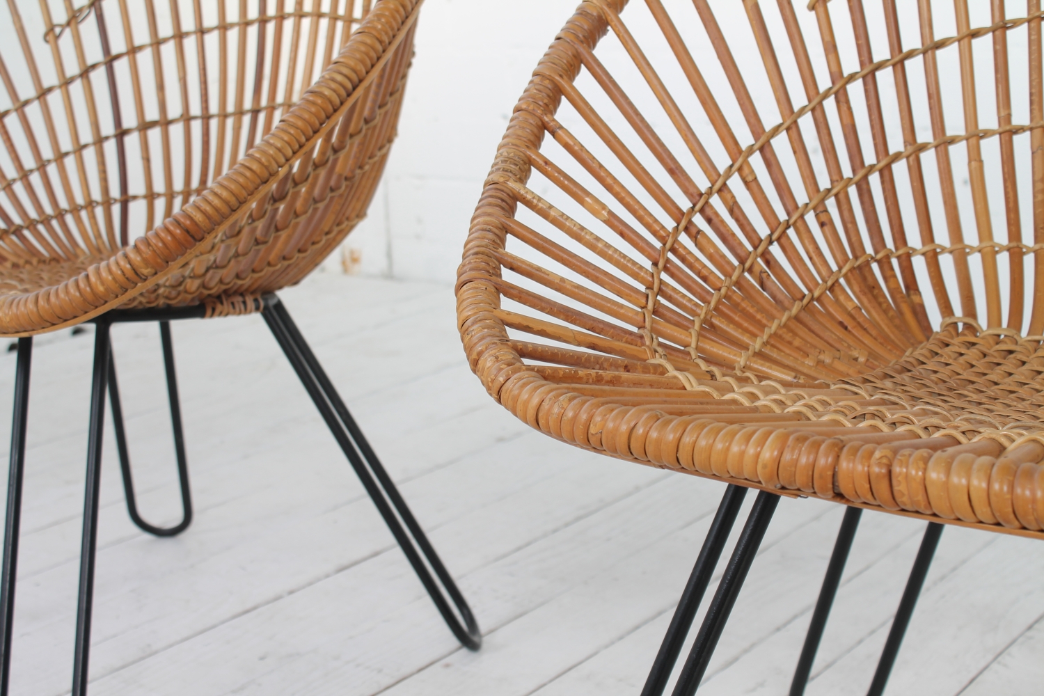 2er Set VintageKorbsessel mit einer Sitzschale aus geflochtenem Bambus. Die Schalen sind auf schwarz lackierten Hairpin-legs aus rundem Stahl montiert.