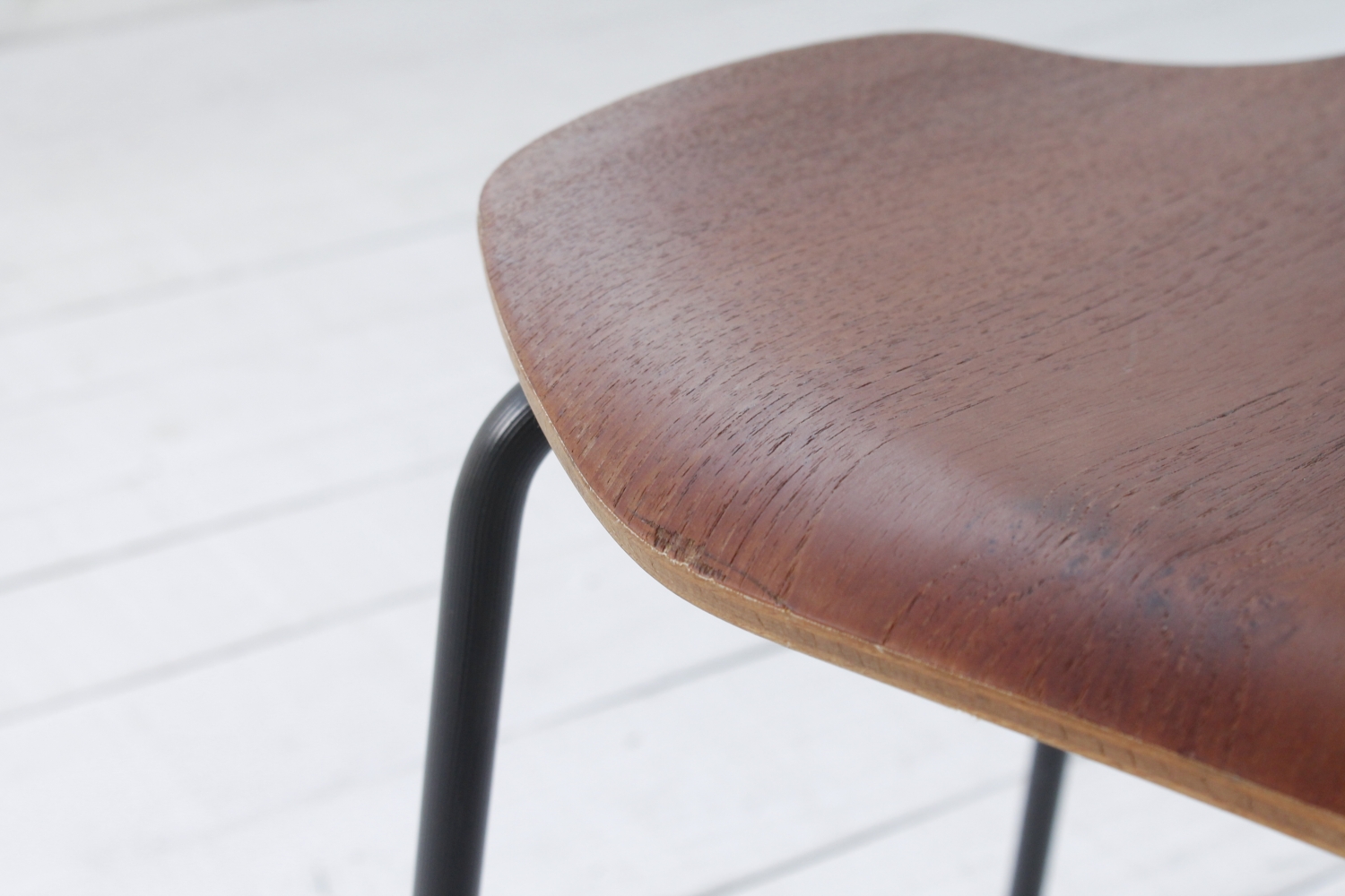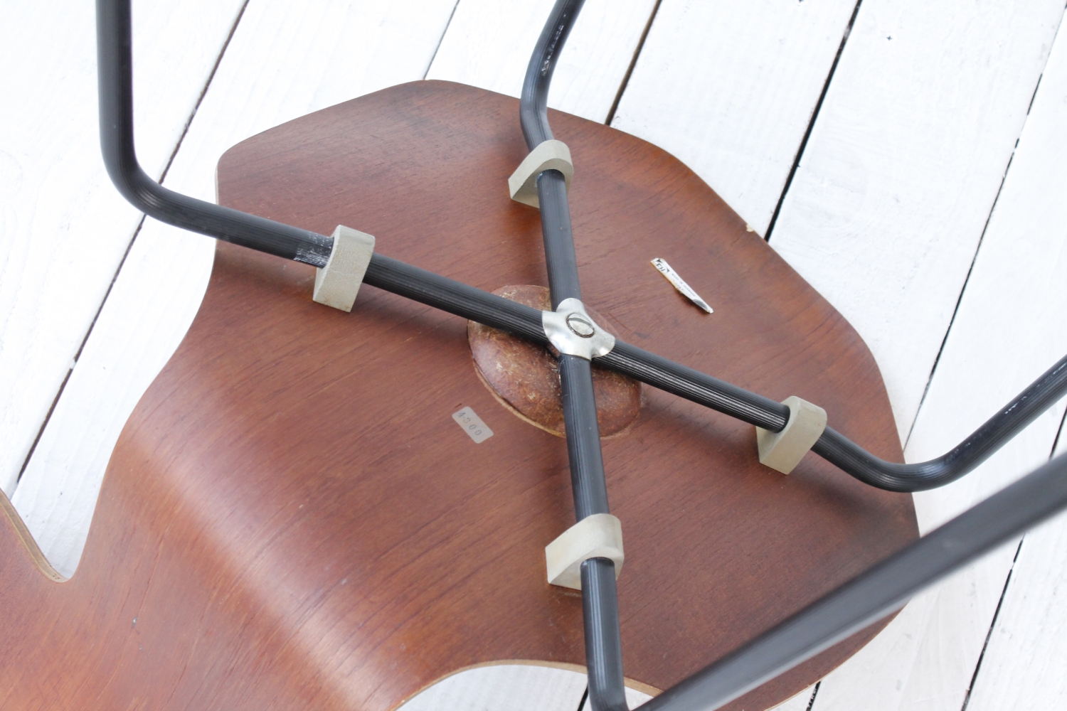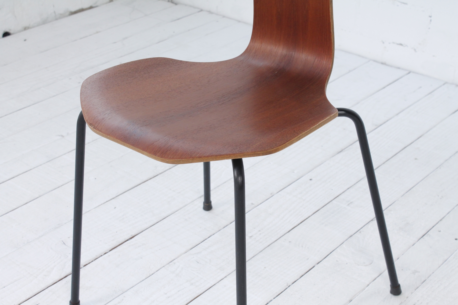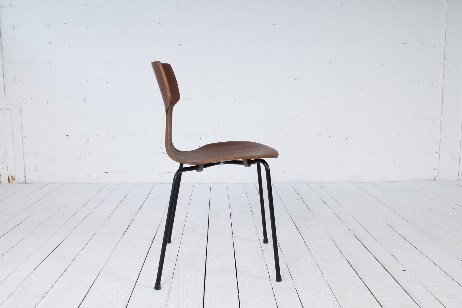 - BeschreibungAlte Ausführung des 3103 Stuhl von Arne Jacobsen. Sitzschale aus in Form gebogenen Schichtholz, Gestell aus schwarz lackiertem Stahlrohr.