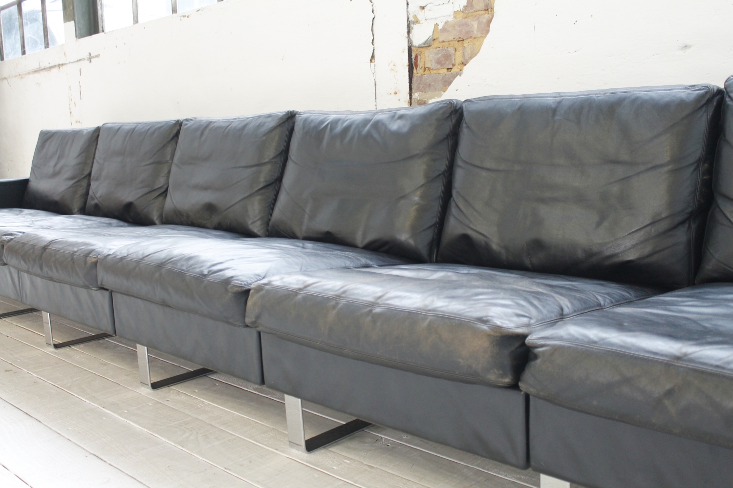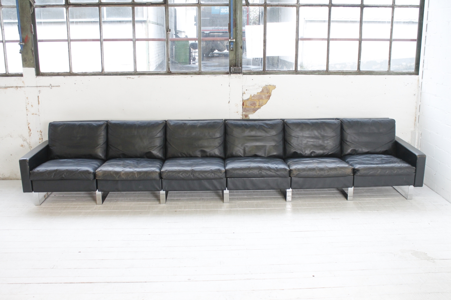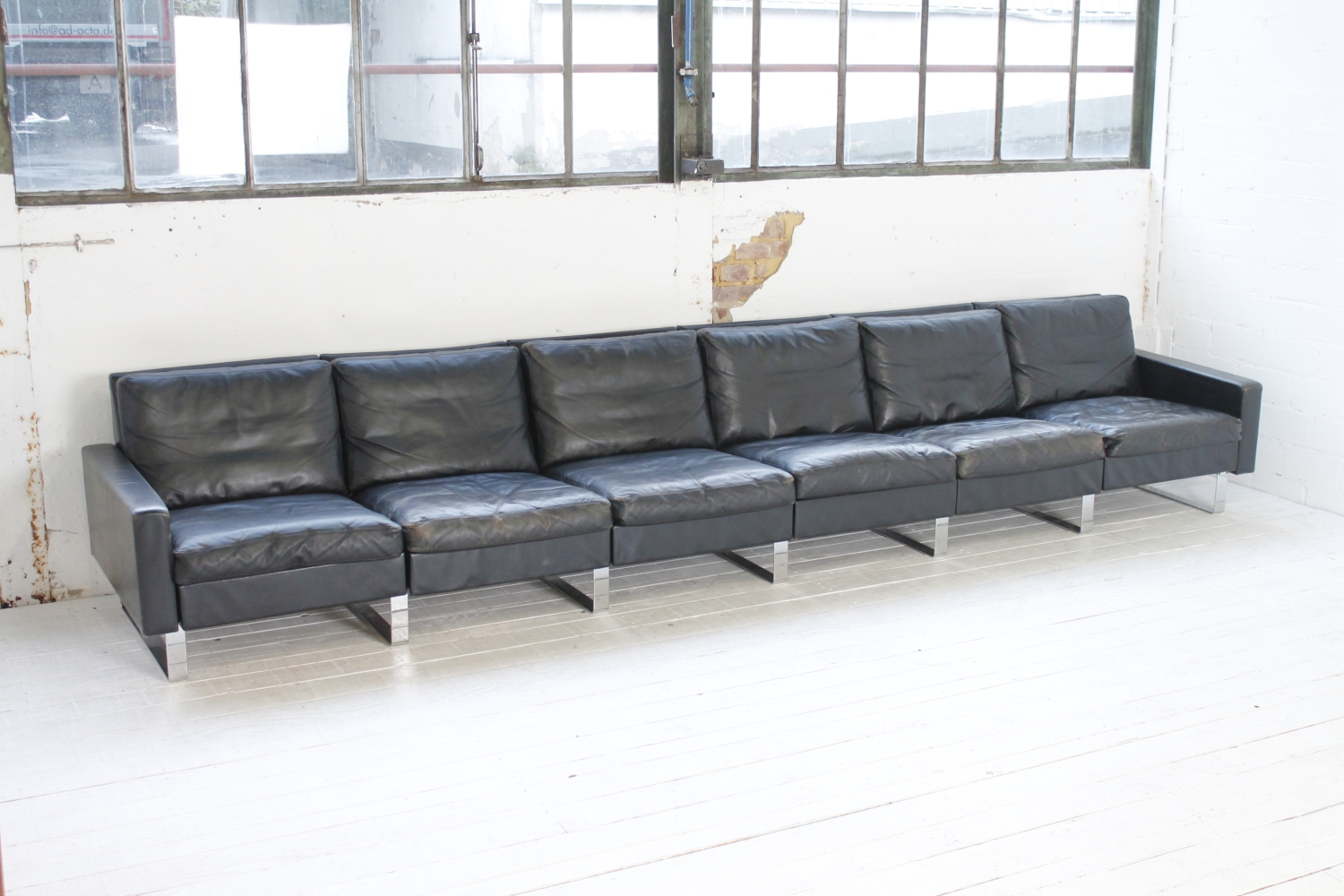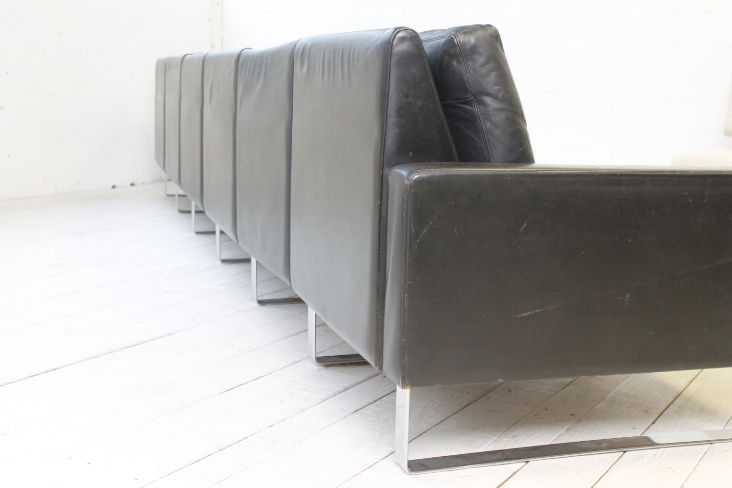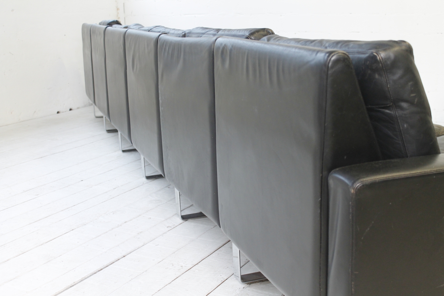 - BeschreibungGroßes „Conseta“ Modularsofa vom deutschen Hersteller COR mit schwarzem Lederbezug und verchromten Füßen. Dieser Entwurf aus dem Jahr 1964 besteht aus 6 einzelnen Modulen (plus Armlehnen) und lässt sich nach Belieben kombinieren.