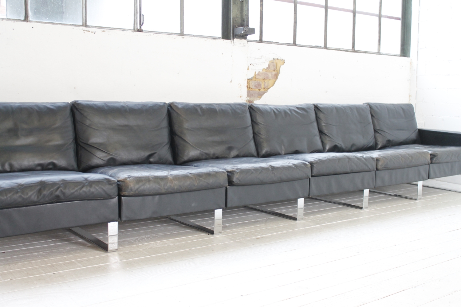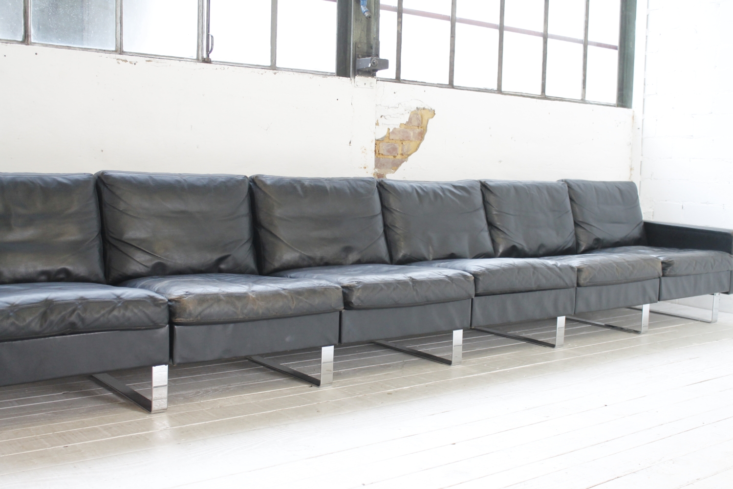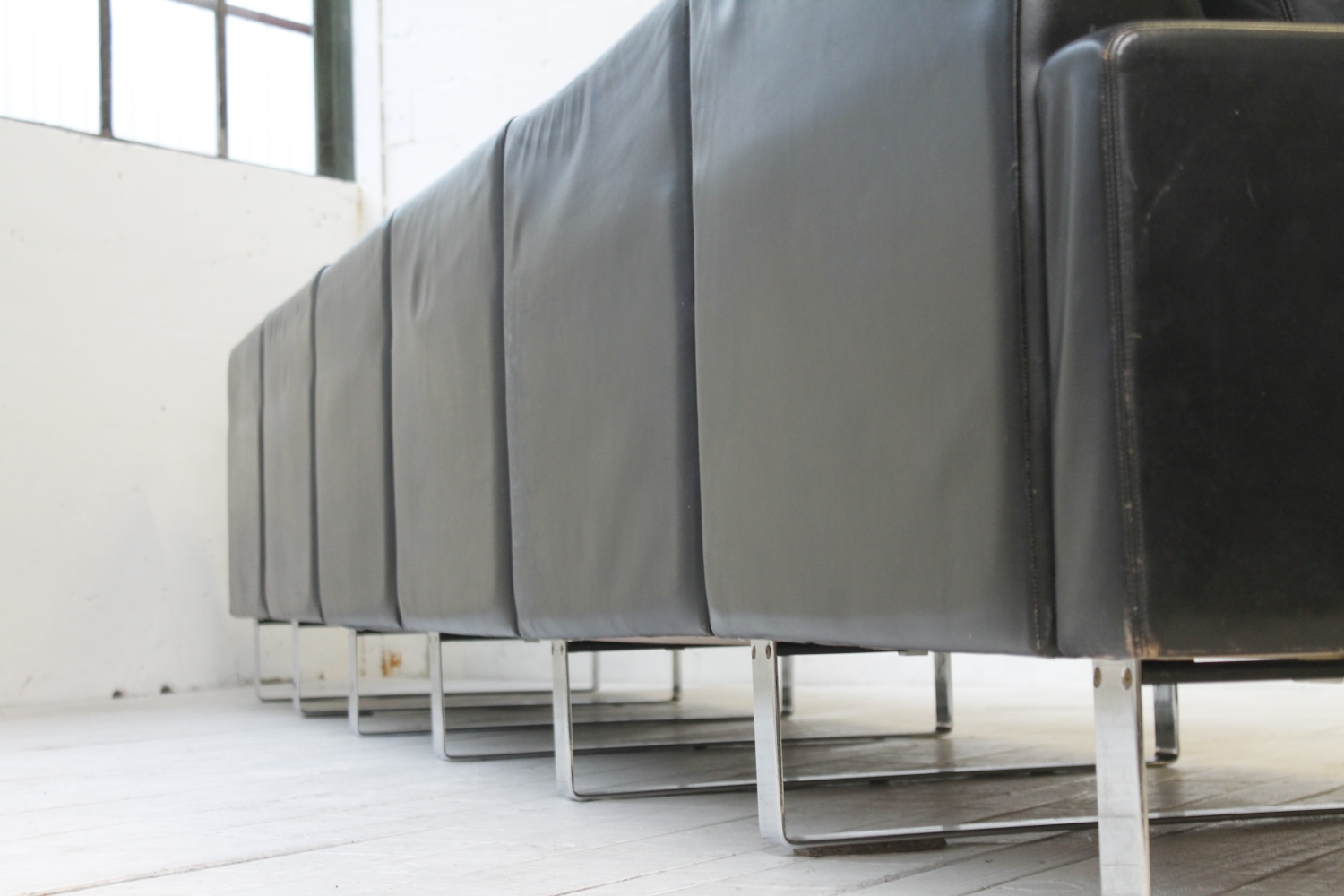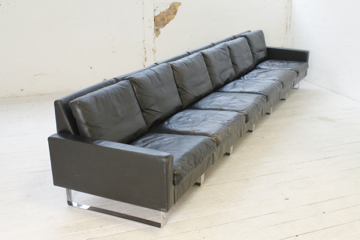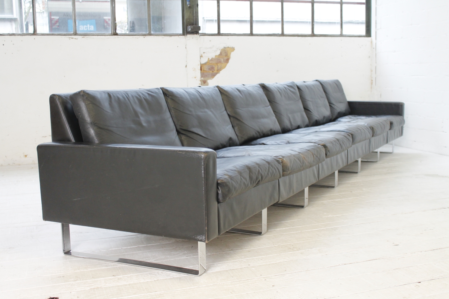 - BeschreibungGroßes „Conseta“ Modularsofa vom deutschen Hersteller COR mit schwarzem Lederbezug und verchromten Füßen. Dieser Entwurf aus dem Jahr 1964 besteht aus 6 einzelnen Modulen (plus Armlehnen) und lässt sich nach Belieben kombinieren.