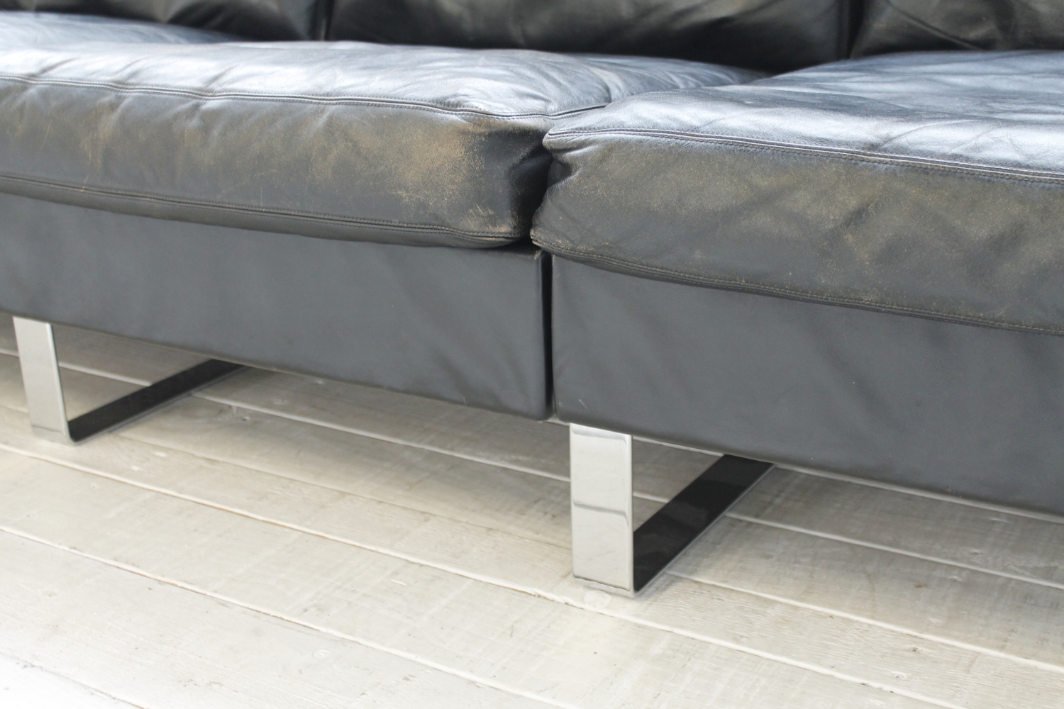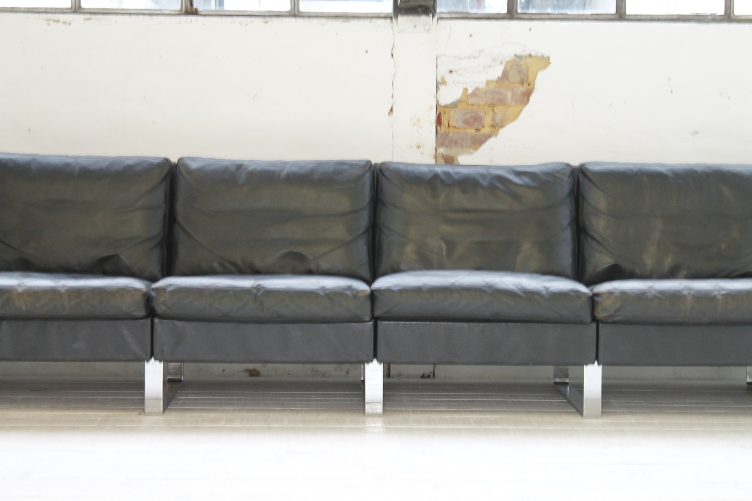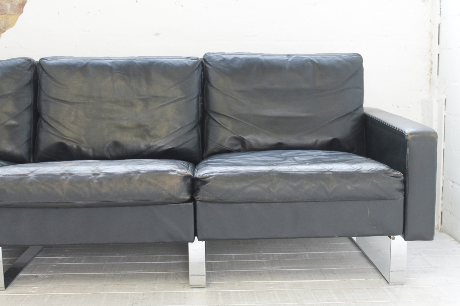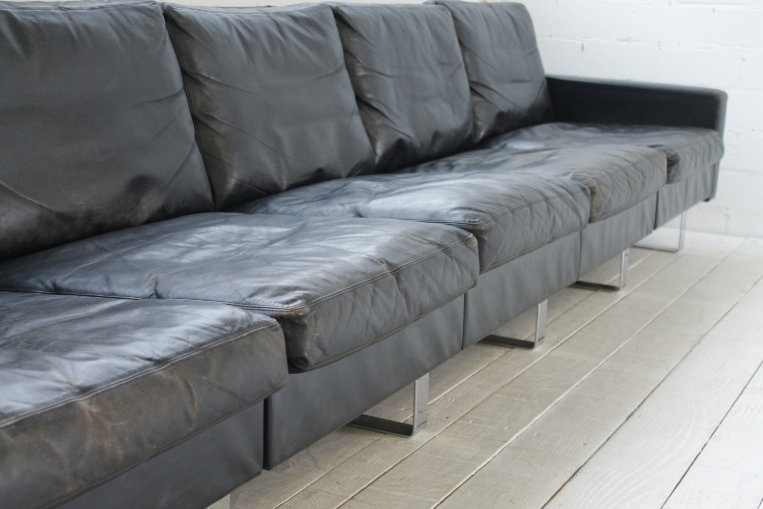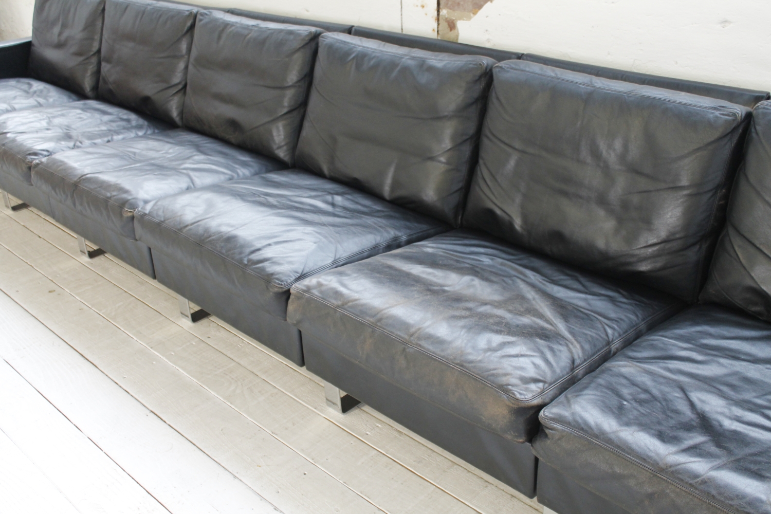 - BeschreibungGroßes „Conseta“ Modularsofa vom deutschen Hersteller COR mit schwarzem Lederbezug und verchromten Füßen. Dieser Entwurf aus dem Jahr 1964 besteht aus 6 einzelnen Modulen (plus Armlehnen) und lässt sich nach Belieben kombinieren.