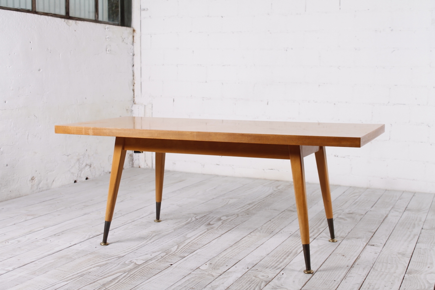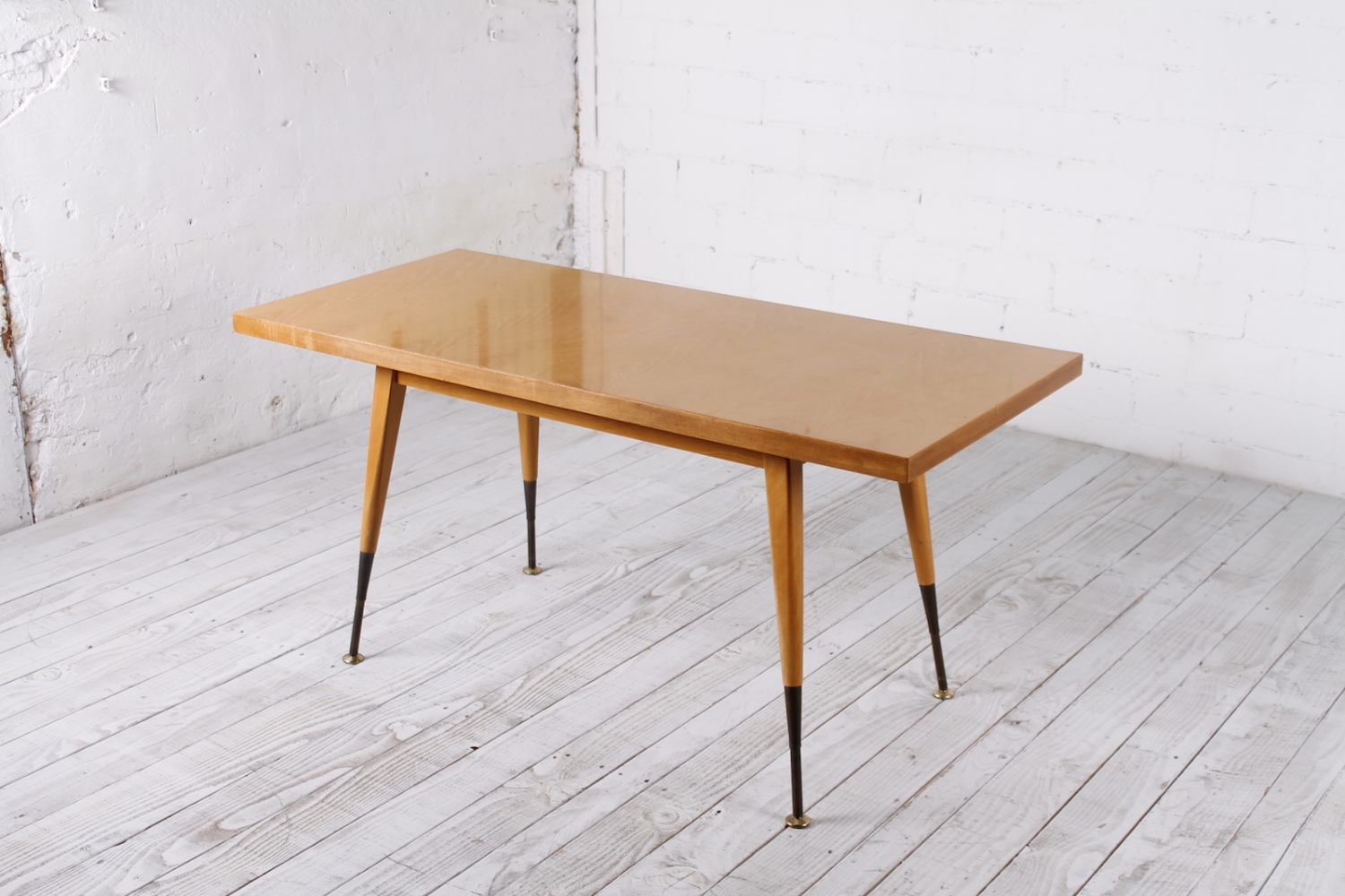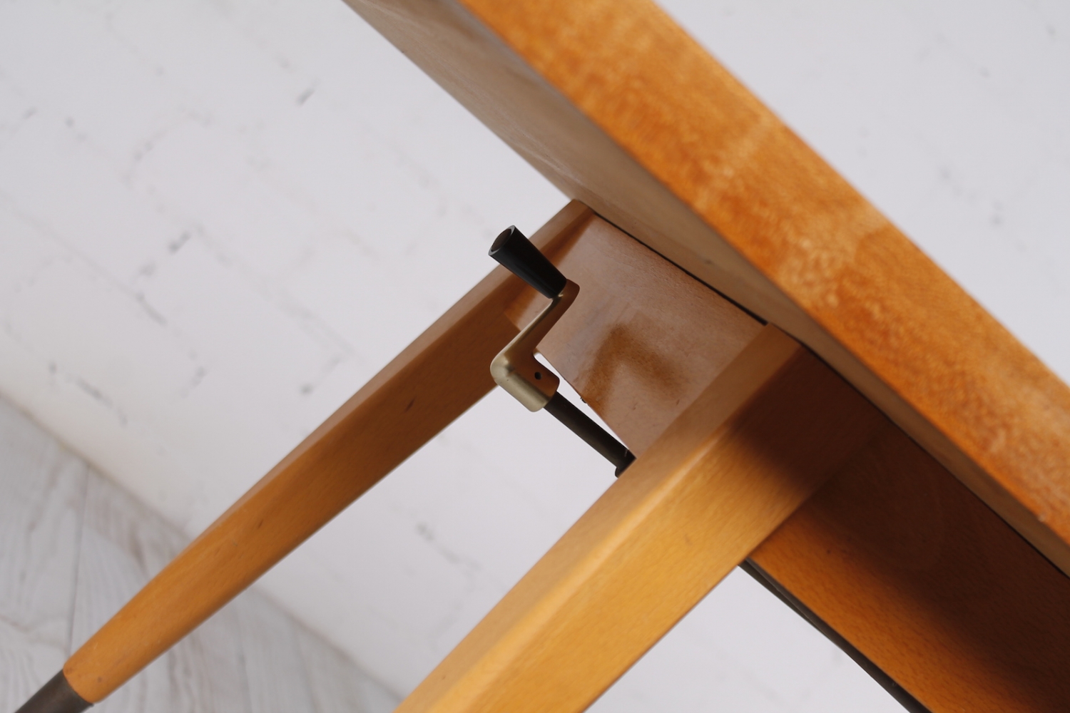 - BeschreibungSchlichte Tischplatte mit schrägen Beinen. Höhenverstellbarer Unterkonstruktion. Hergestellt aus Lackierter Buche und Messing.