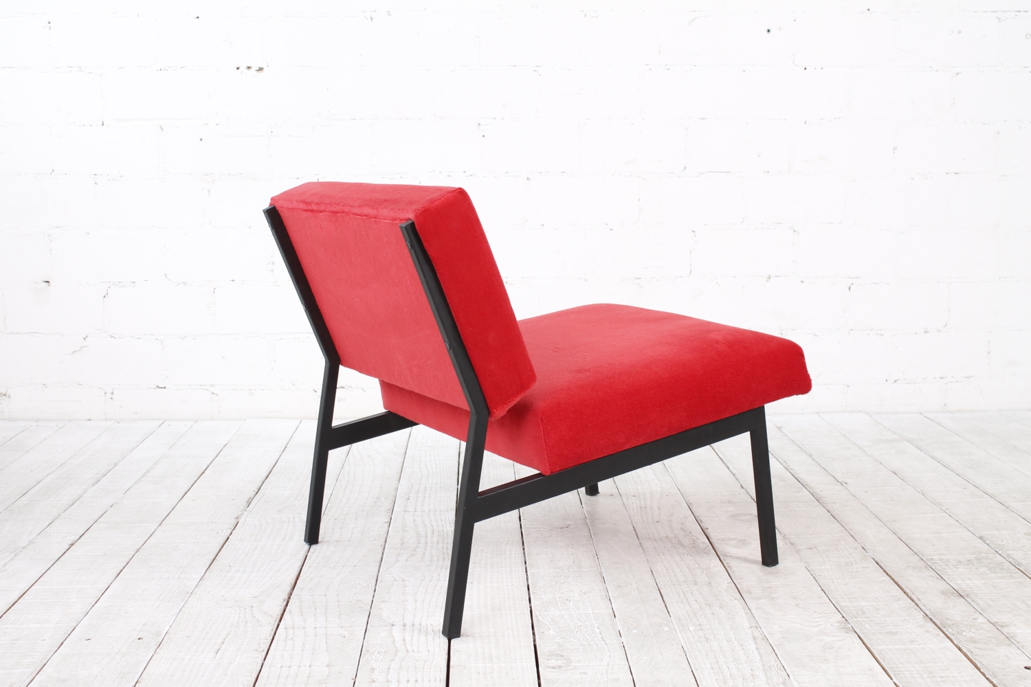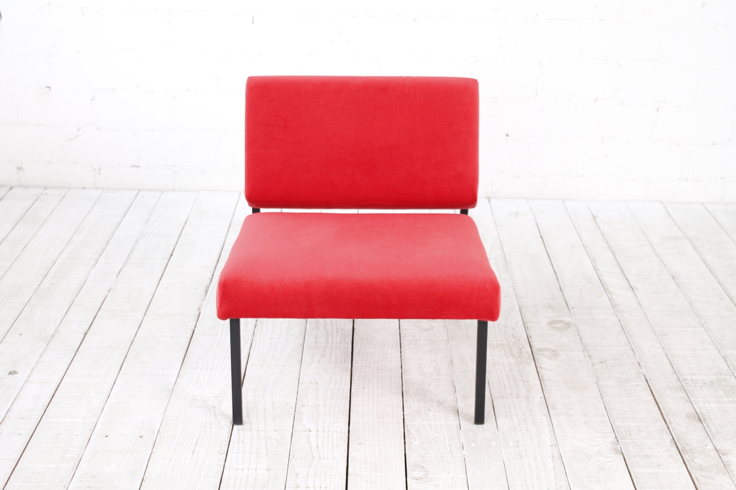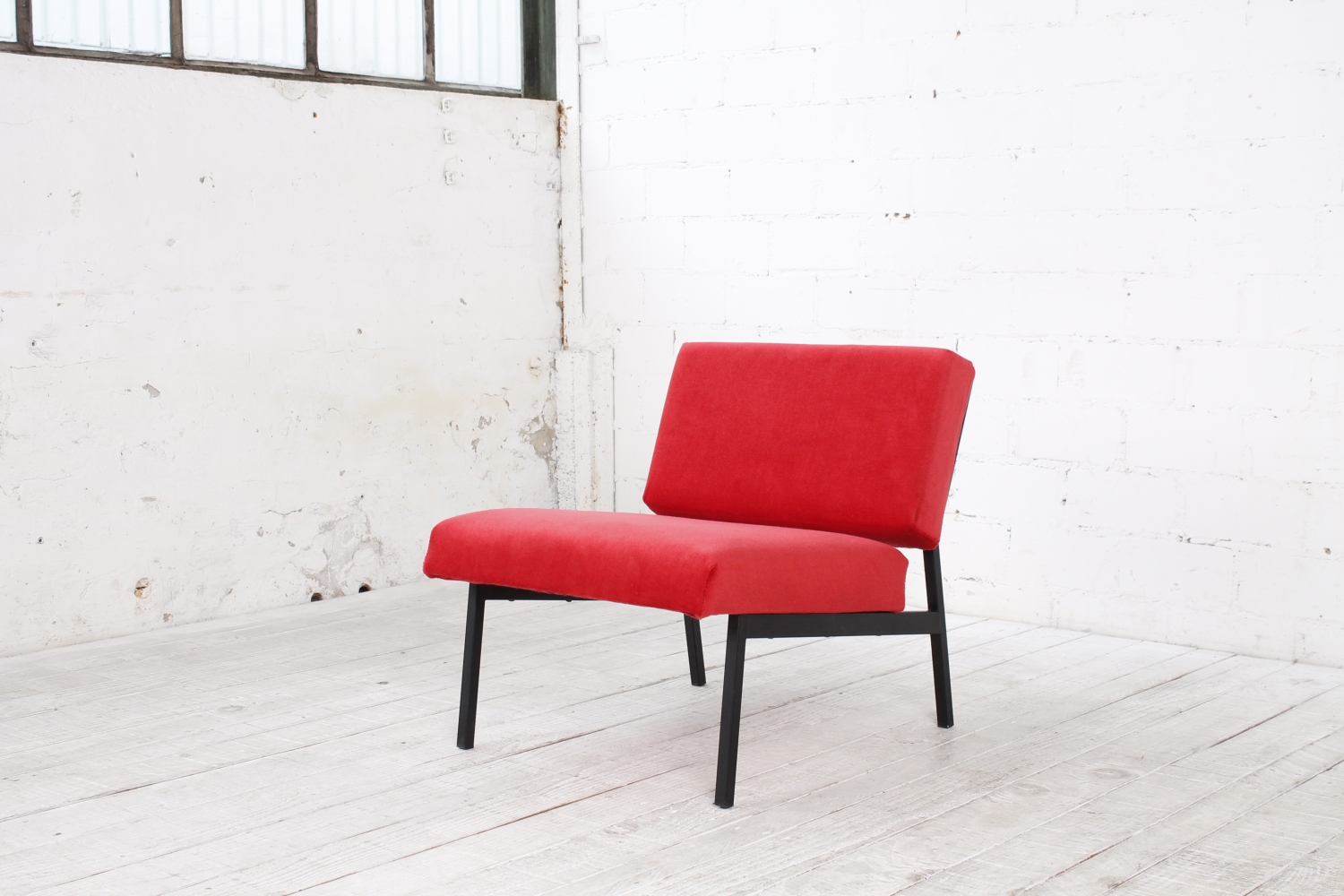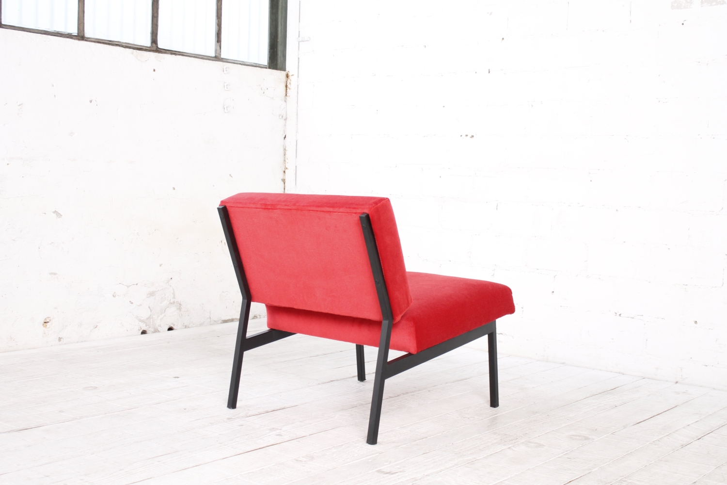 - BeschreibungSchlichter, geometrisch gehaltener Lounge Chair mit einem Gestell aus schwarzem Vierkantstahlrohr und Polstern mit rotem Bezug. Der Entwurf erinnert an Arbeiten von Herbert Hirche und Dieter Waeckerlin.