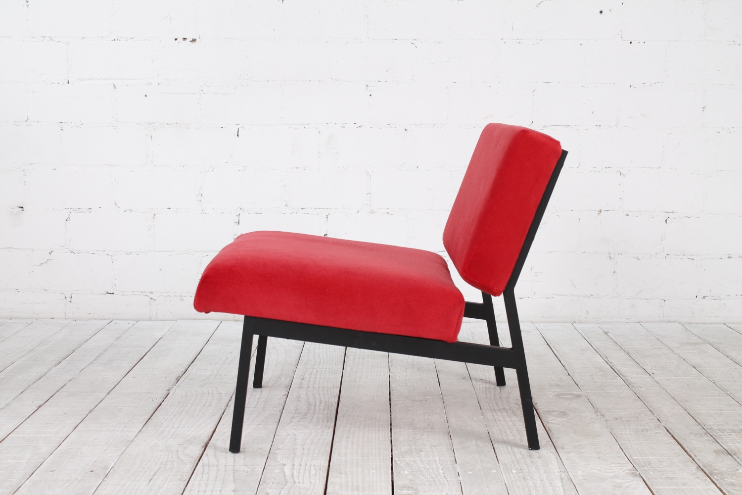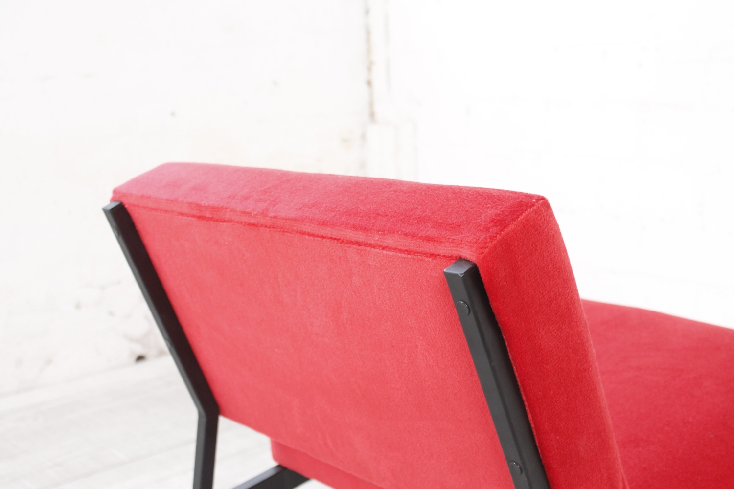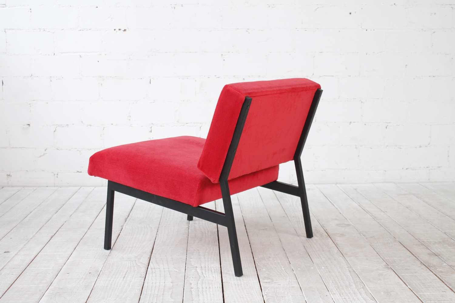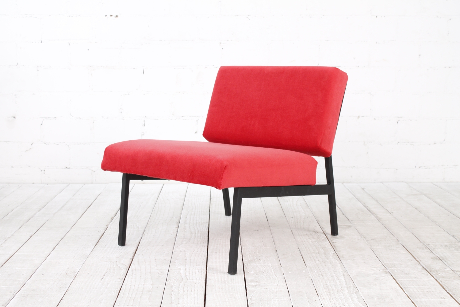 - BeschreibungSchlichter, geometrisch gehaltener Lounge Chair mit einem Gestell aus schwarzem Vierkantstahlrohr und Polstern mit rotem Bezug. Der Entwurf erinnert an Arbeiten von Herbert Hirche und Dieter Waeckerlin.