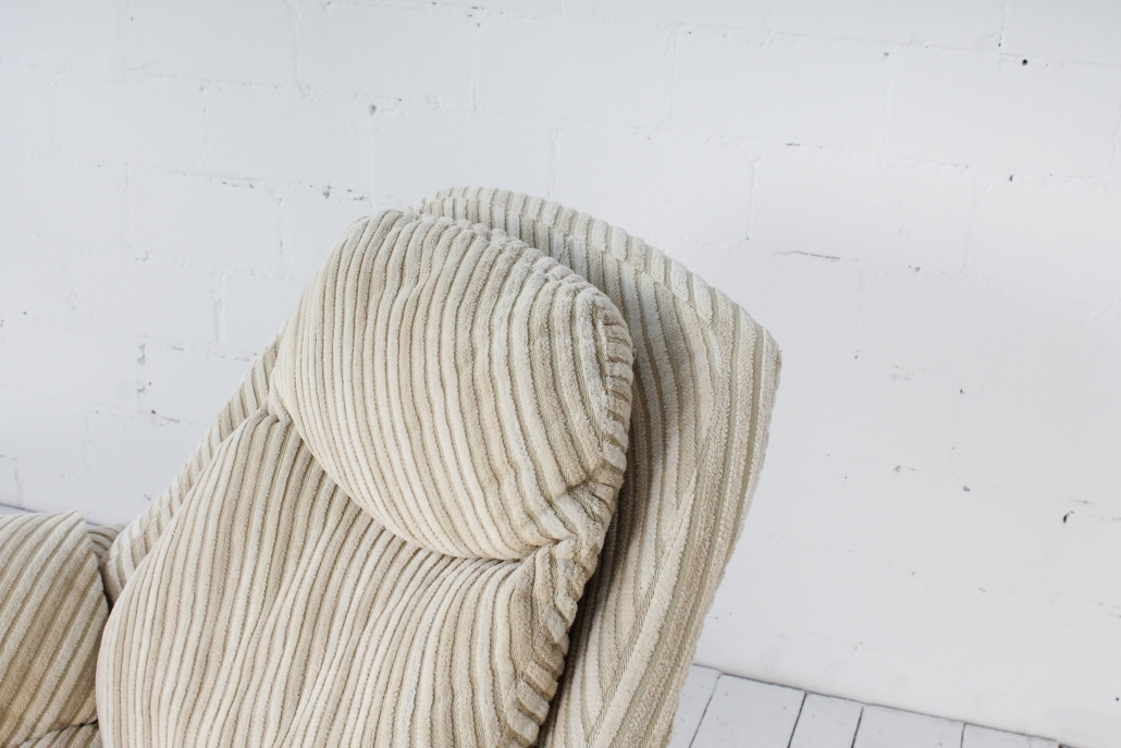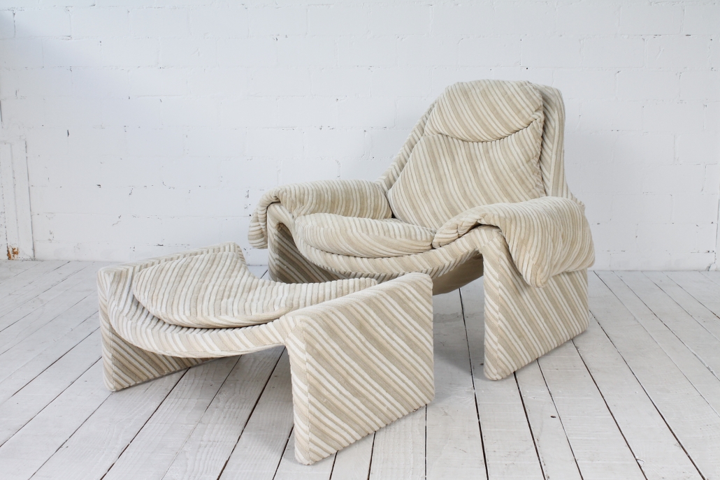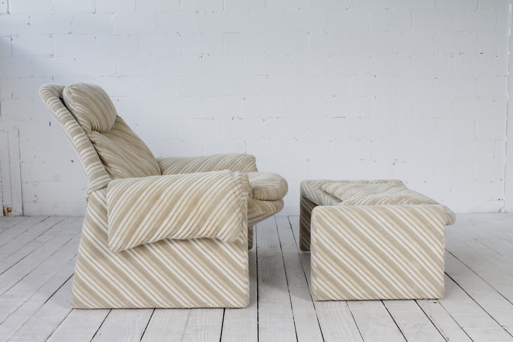 - BeschreibungAußerordentlich bequemes Set bestehend aus Sessel und passendem Ottoman. Der Entwurf stammt aus den 1970ern von Vittorio Introini. Der Bezug ist in dezent beigem Streifenmuster gehalten.