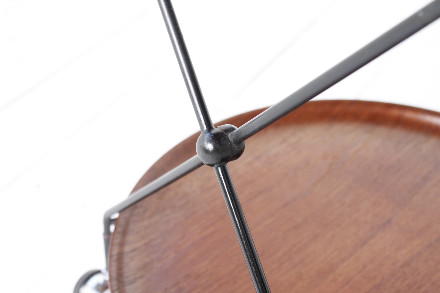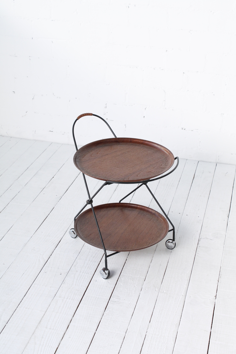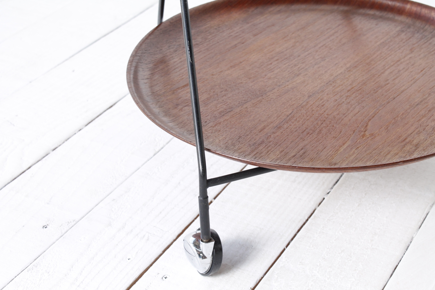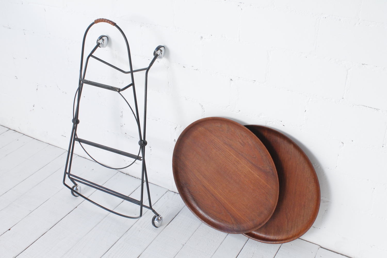 - BeschreibungEleganter Servierwagen mit einem Gestell aus schwarz lackiertem Stahlrohr und zwei Schalen aus Teak Furnier, die sich herausnehmen lassen. Das Gestell lässt sich zum Verstauen zusammenklappen.