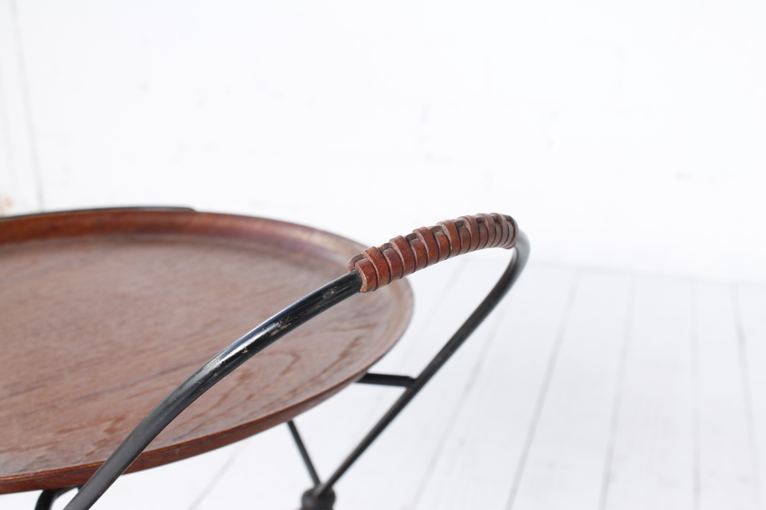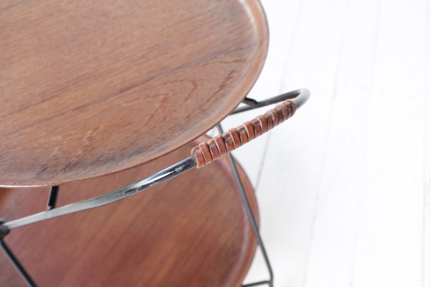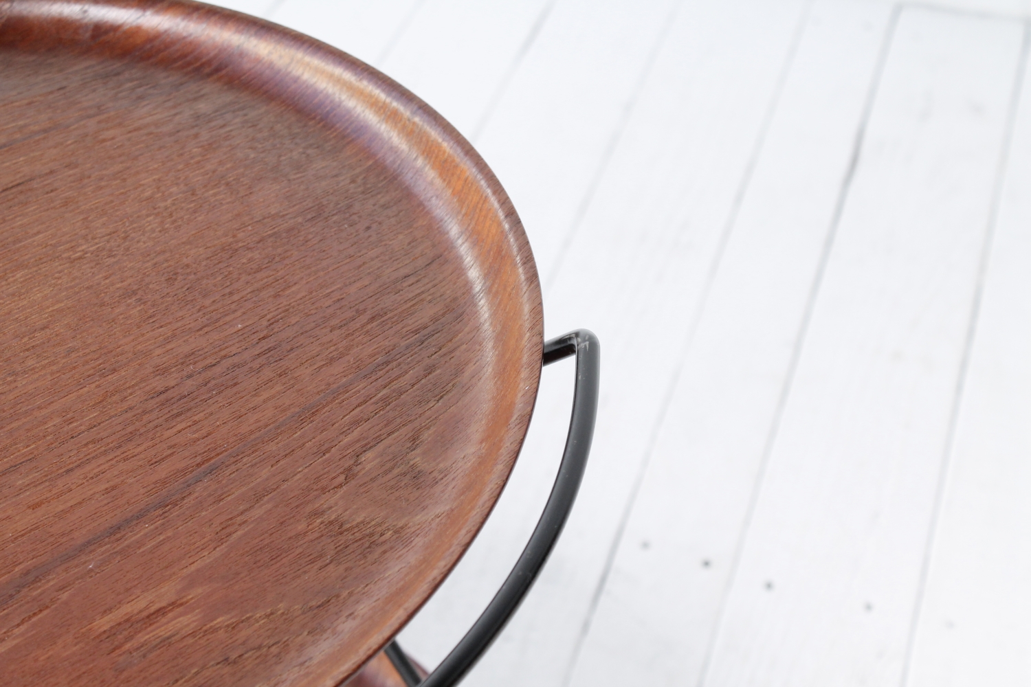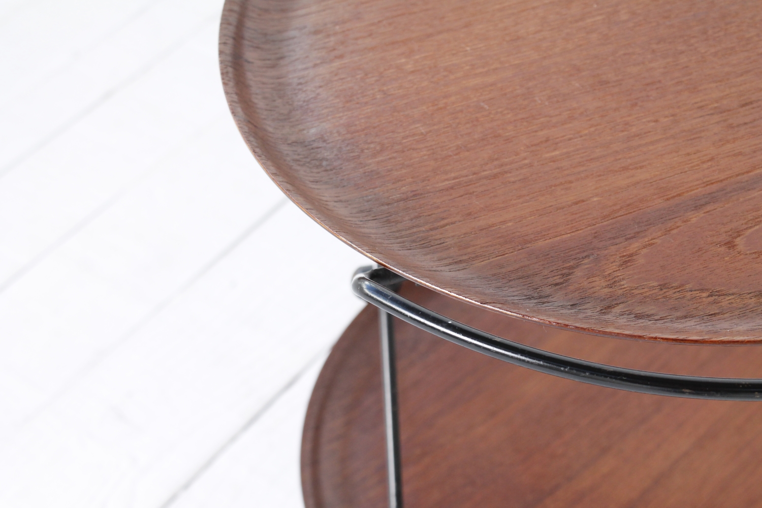 - BeschreibungEleganter Servierwagen mit einem Gestell aus schwarz lackiertem Stahlrohr und zwei Schalen aus Teak Furnier, die sich herausnehmen lassen. Das Gestell lässt sich zum Verstauen zusammenklappen.