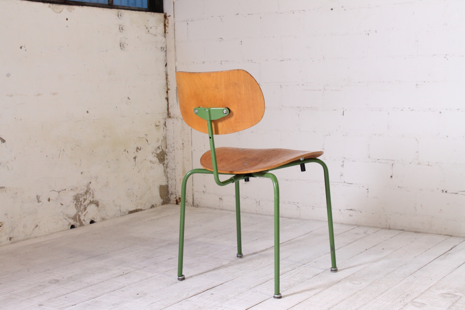Deutscher Designklassiker von Egon Eiermann in seltener Ausführung. Die Base ist aus grün lackiertem Stahlrohr gefertigt und die Sitzschale und Rückenlehne aus geschichtetem Buchenholz.