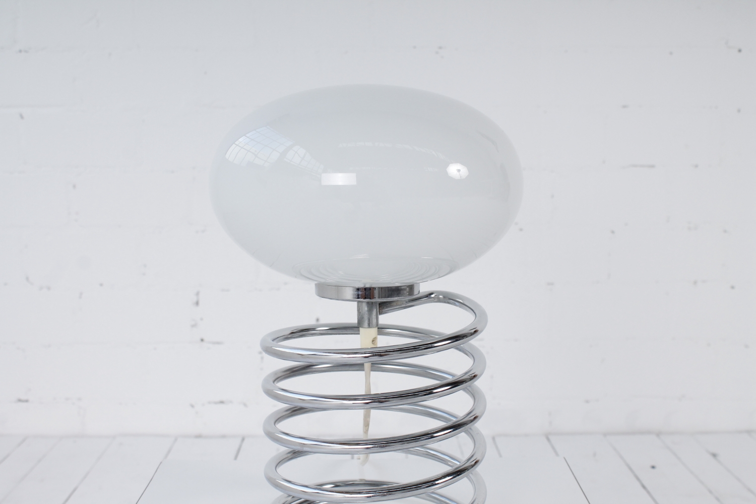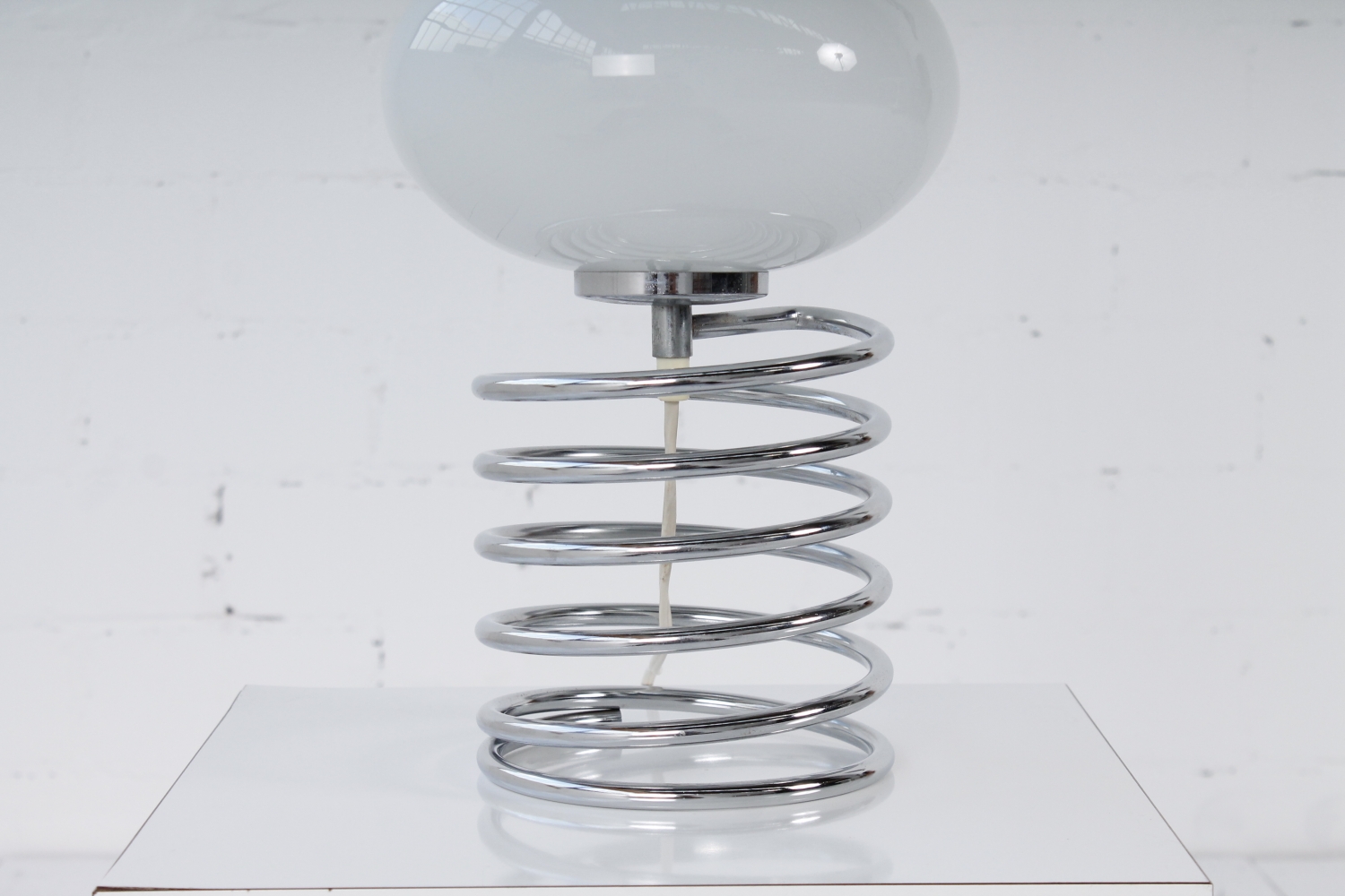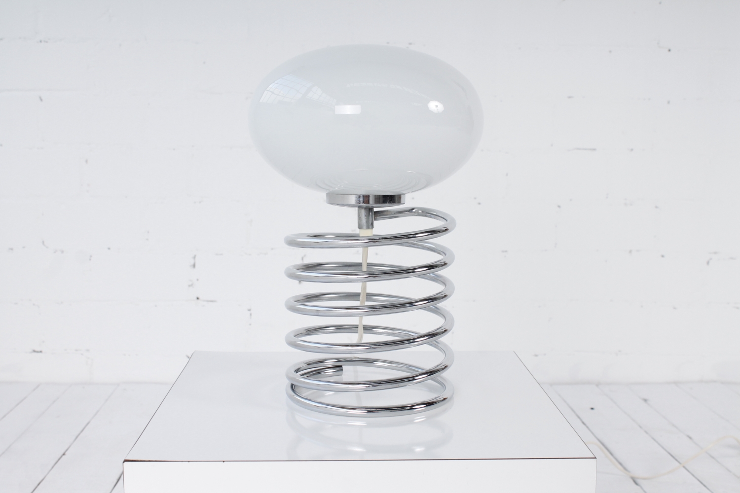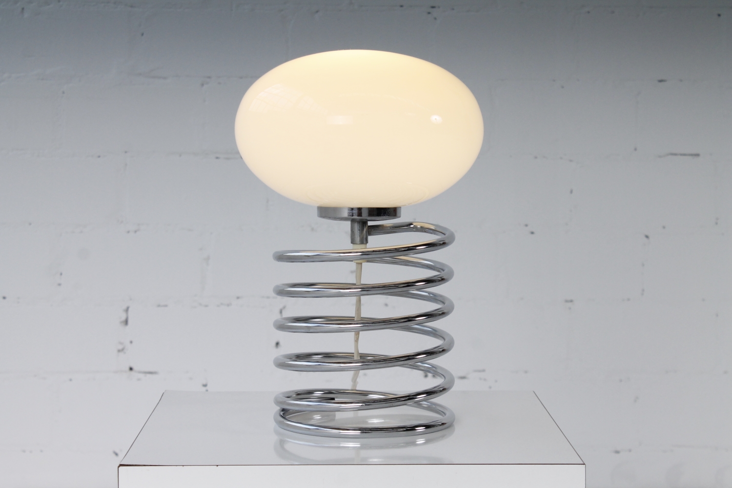 - BeschreibungSeltene Spirallampe von Ingo Maurer mit einer verchromte Spirale als Base und einem Diskusförmigen Schirm aus Opalglas.