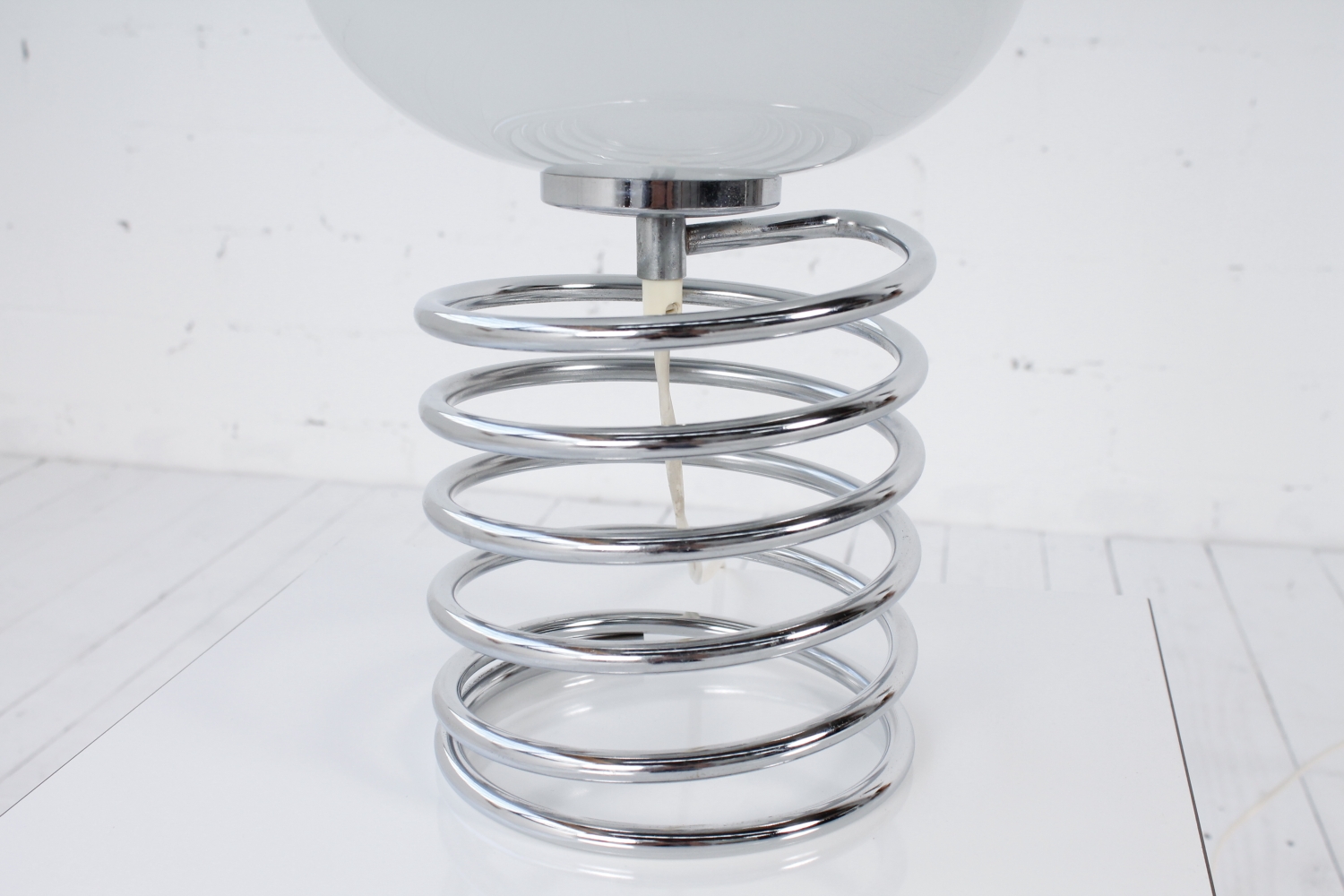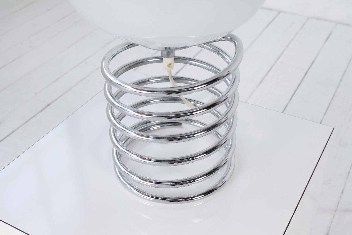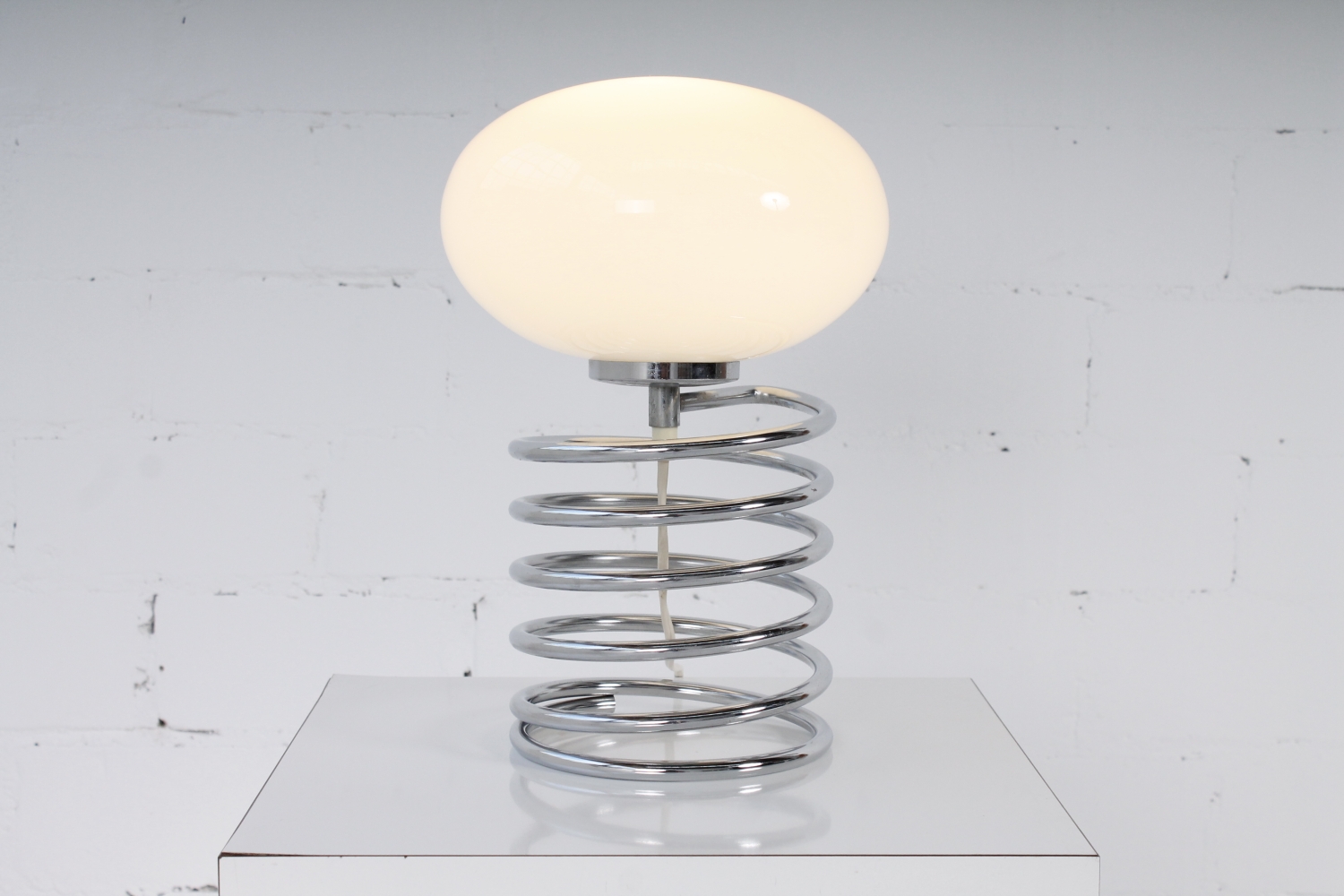 - BeschreibungSeltene Spirallampe von Ingo Maurer mit einer verchromte Spirale als Base und einem Diskusförmigen Schirm aus Opalglas.