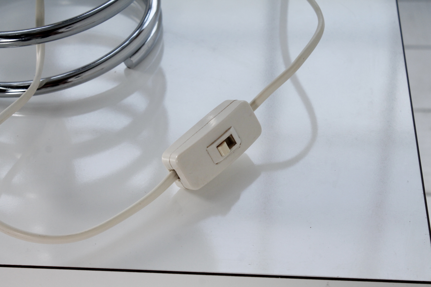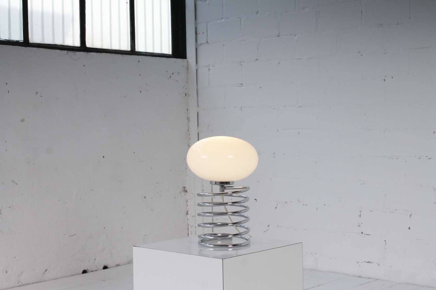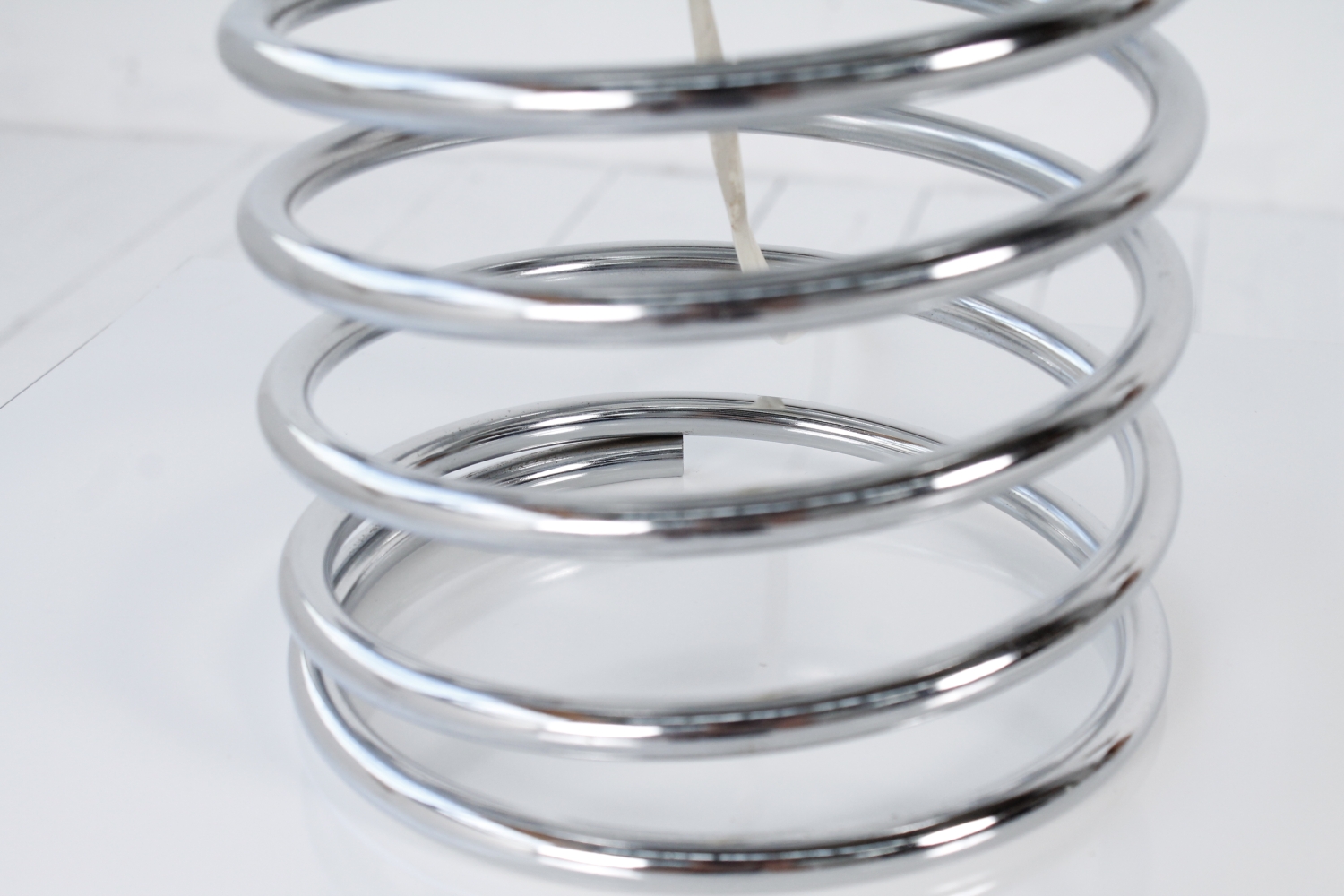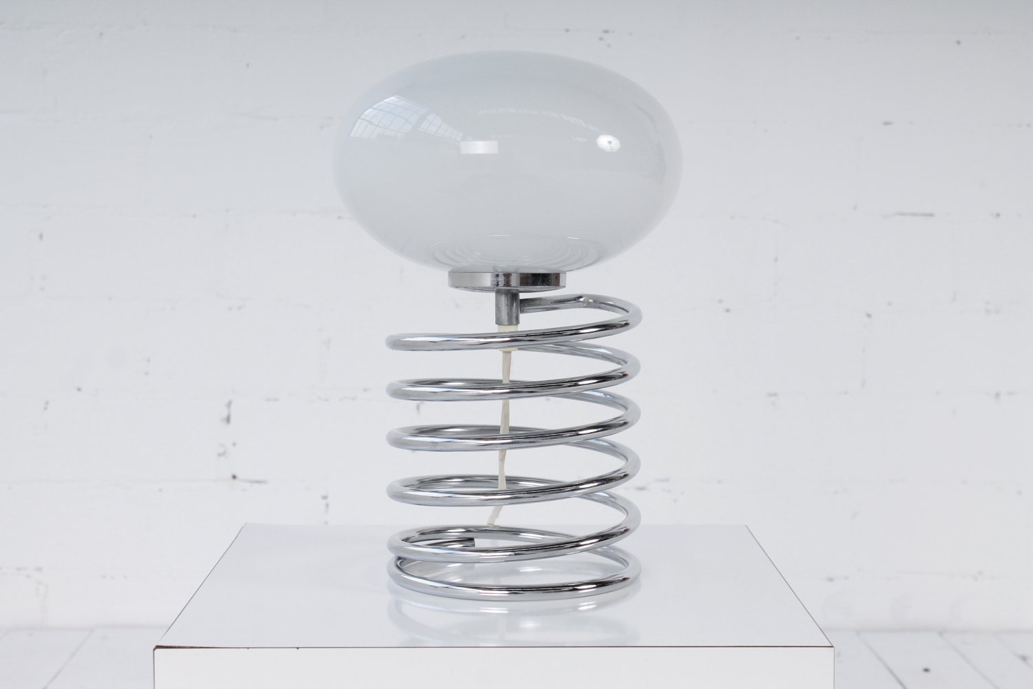 - BeschreibungSeltene Spirallampe von Ingo Maurer mit einer verchromte Spirale als Base und einem Diskusförmigen Schirm aus Opalglas.
