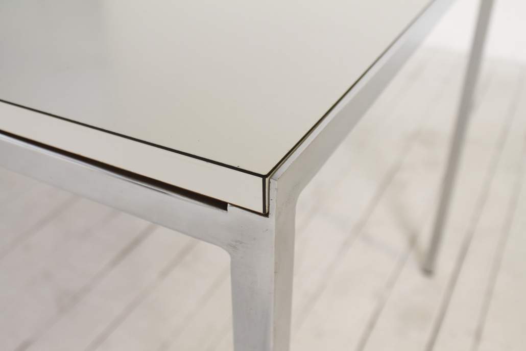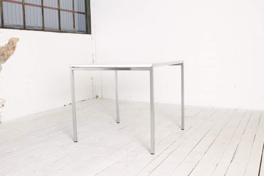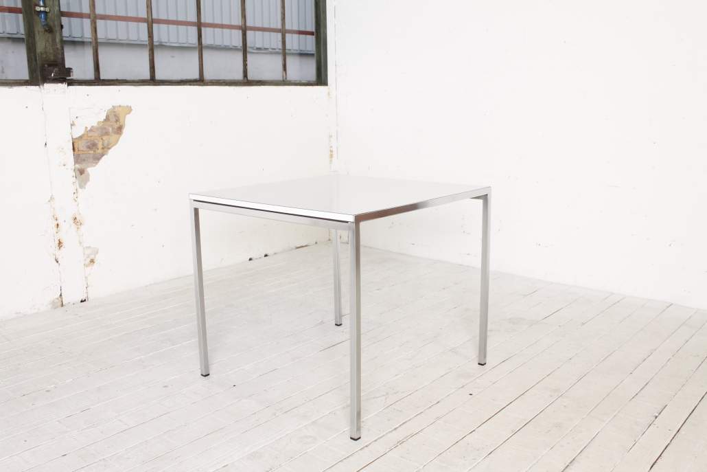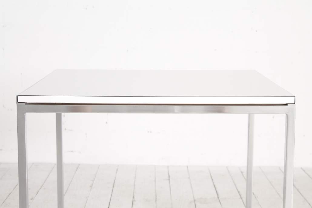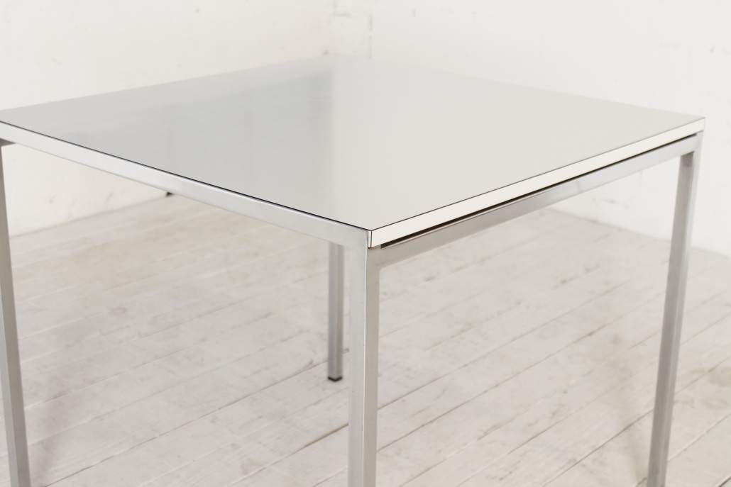 - BeschreibungQuadratischer T-Angle Esstisch im Stile von Florence Knoll. Minimalistischer Entwurf mit einem Gestell aus verchromtem Vierkantstahl und einer weißen Resopal Tischplatte.