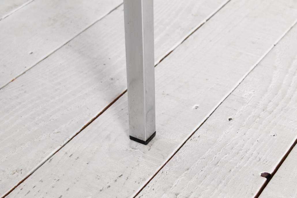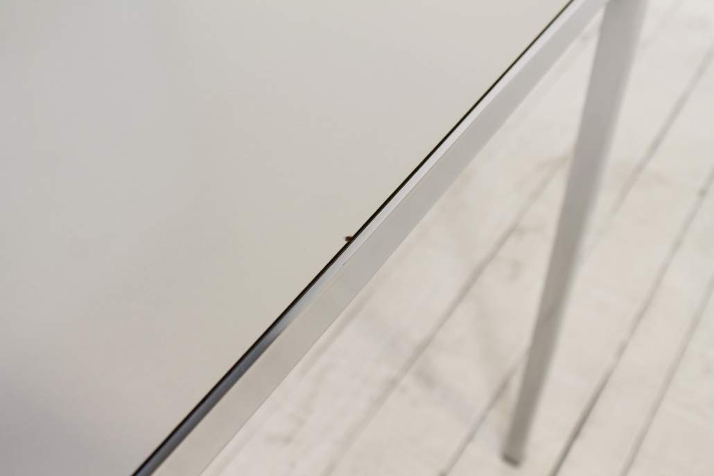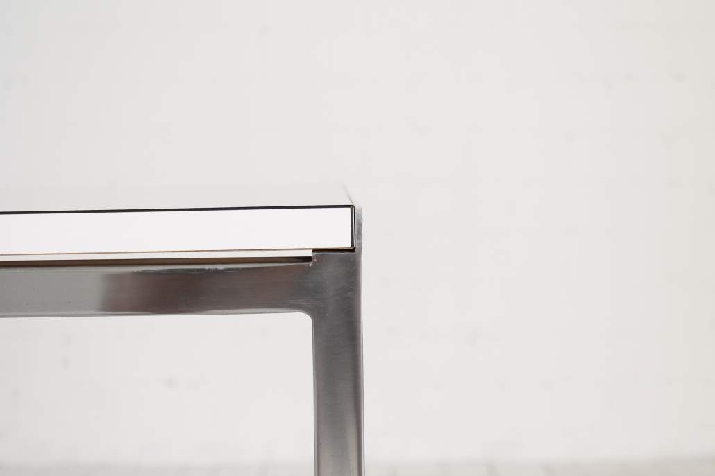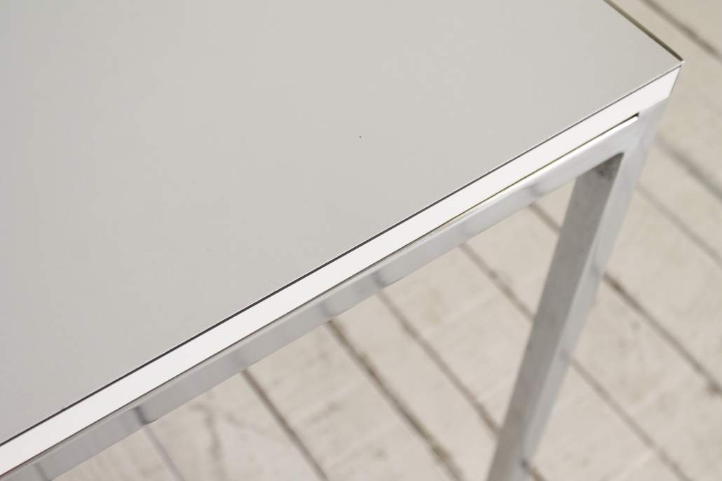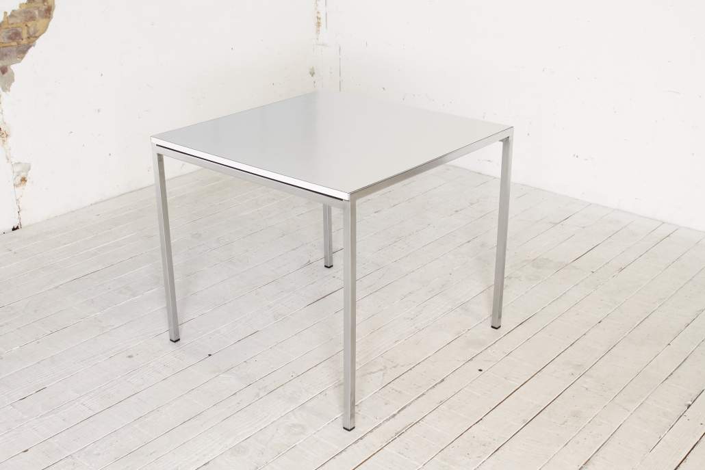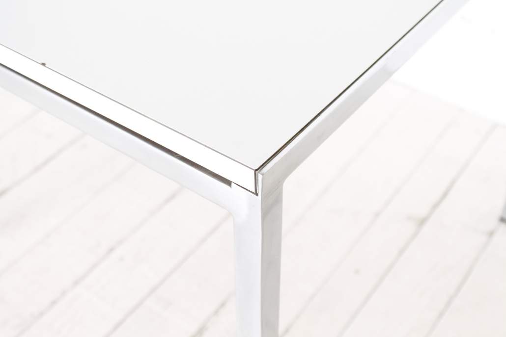 - BeschreibungQuadratischer T-Angle Esstisch im Stile von Florence Knoll. Minimalistischer Entwurf mit einem Gestell aus verchromtem Vierkantstahl und einer weißen Resopal Tischplatte.